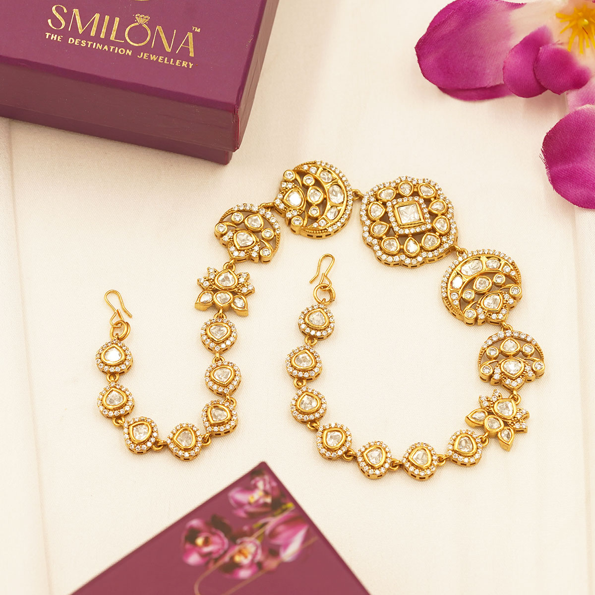 DESCRIPTION - THESE ROYAL GOLD KUNDAN FLORAL MATHA PATTI. DESIGNED IN A LUXURIOUS GOLD-TONE FINISH, THESE MATHA PATTI SHOWCASE AN ELEGANT ARRANGEMENT OF FINELY CRAFTED FLORAL MOTIFS, EACH EMBELLISHED WITH RADIANT KUNDAN-STYLE STONES THAT REFLECT LIGHT WITH EVERY MOVEMENT.