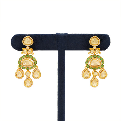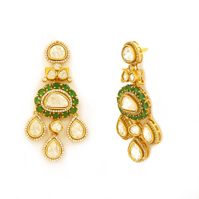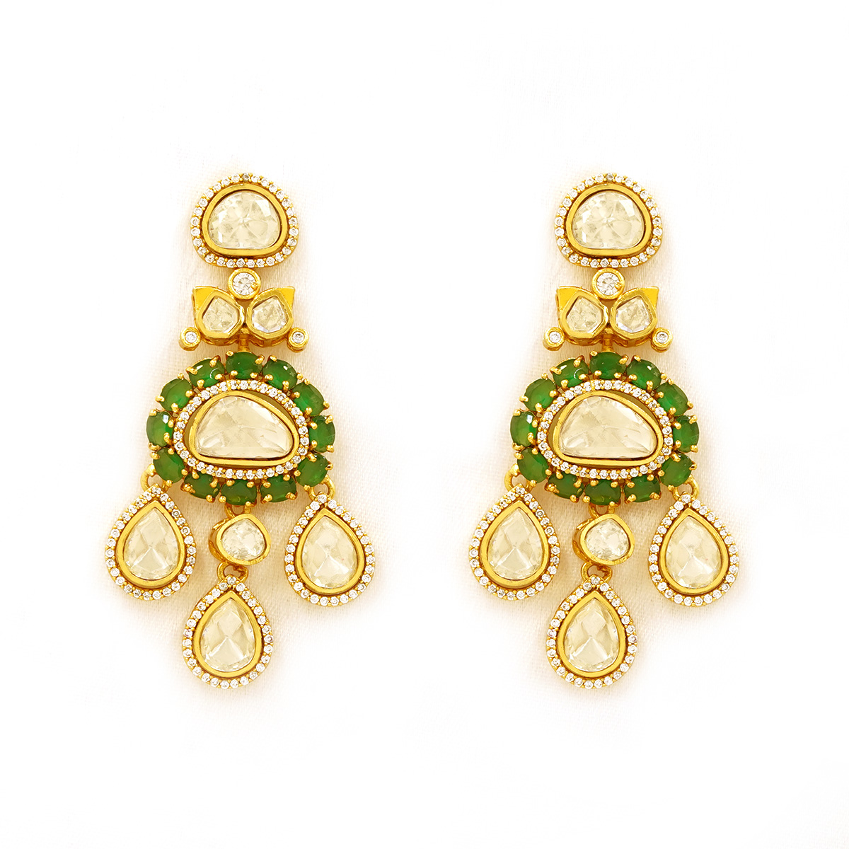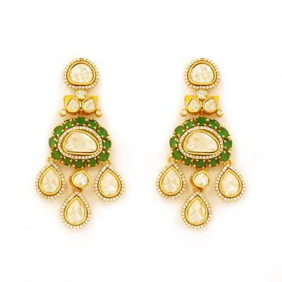 DESCRIPTION - ADORN YOURSELF WITH TIMELESS ELEGANCE IN THESE ROYAL GREEN KUNDAN DROP EARRINGS. CRAFTED WITH A TRADITIONAL KUNDAN SETTING, THESE EARRINGS FEATURE A GRACEFUL ARRANGEMENT OF TEARDROP-SHAPED STONES ACCENTED WITH RICH GREEN ENAMEL DETAILING. THE LAYERED DESIGN AND DELICATE DANGLING MOTIFS CREATE A LUXURIOUS, REGAL LOOK THAT BEAUTIFULLY COMPLEMENTS FESTIVE, BRIDAL, AND ETHNIC ENSEMBLES. LIGHTWEIGHT YET STATEMENT-WORTHY, THEY ARE PERFECT FOR WEDDINGS, CELEBRATIONS, AND SPECIAL OCCASIONS WHERE YOU WANT TO SHINE WITH CLASSIC CHARM.