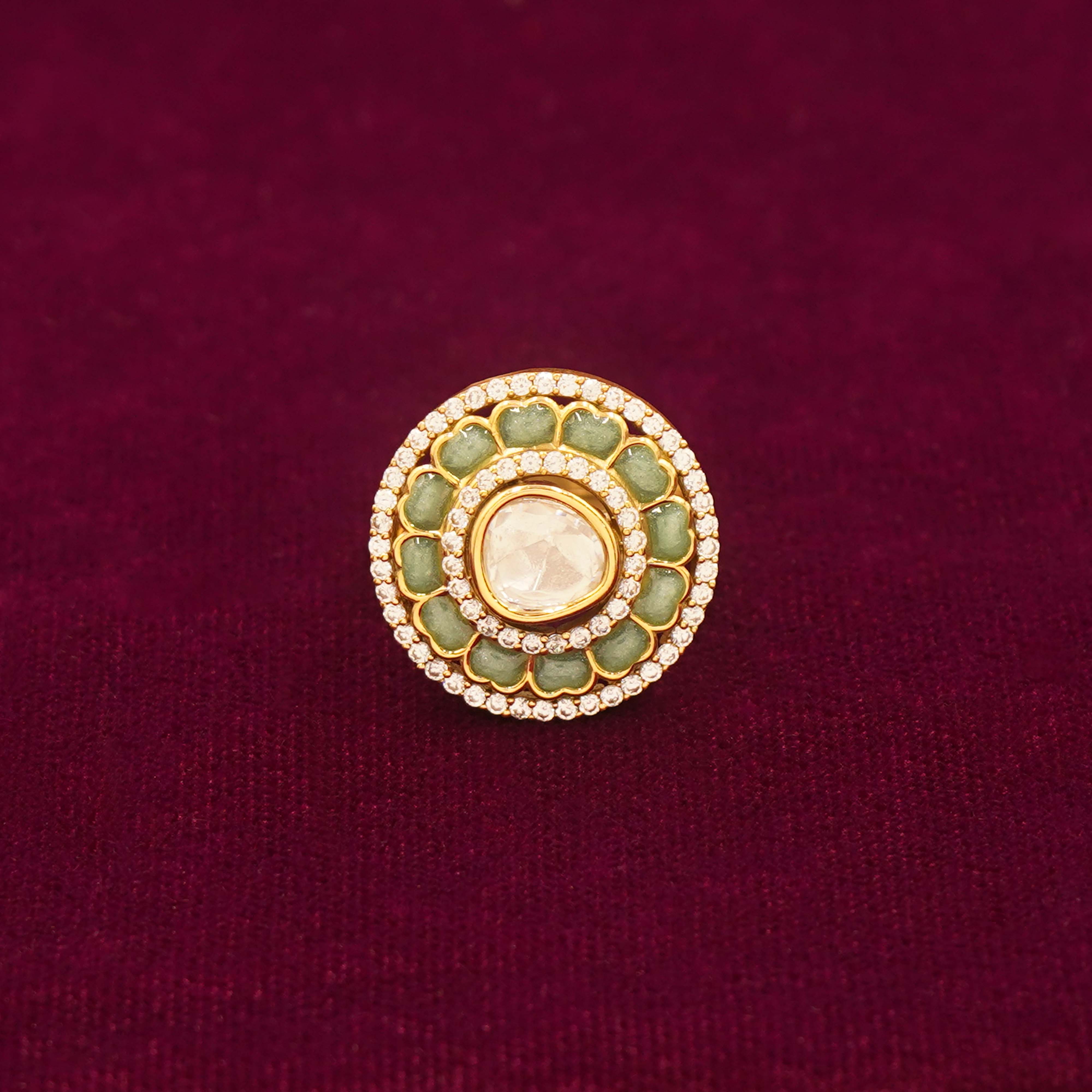 DESCRIPTION - ELEVATE YOUR ELEGANCE WITH THIS EXQUISITE ROYAL KUNDAN CIRCLE GOLD RING. CRAFTED WITH A RADIANT GOLD-TONE FINISH, IT FEATURES A LUMINOUS CENTRAL KUNDAN STONE ENCIRCLED BY DELICATELY SET CRYSTALS FOR A TIMELESS, REGAL APPEAL. PERFECT FOR WEDDINGS, FESTIVE CELEBRATIONS, OR STATEMENT OCCASIONS, THIS RING BLENDS TRADITIONAL CHARM WITH REFINED SOPHISTICATION, MAKING IT A MUST-HAVE ADDITION TO YOUR JEWELRY COLLECTION.