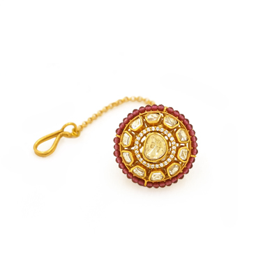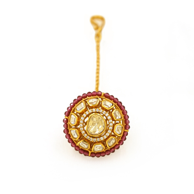 DESCRIPTION - BORLA, ELEVATE YOUR TRADITIONAL LOOK WITH THE EXQUISITE CHARM OF THE ROYAL KUNDAN PEARL BORLA. DESIGNED WITH A CIRCULAR FLORAL-INSPIRED MOTIF, THIS HAIR ACCESSORY SHOWCASES FINELY SET KUNDAN STONES AT THE CENTER, FRAMED BY LUSTROUS PEARL ACCENTS THAT ADD SOFTNESS AND SOPHISTICATION. THE WARM GOLD-TONED FINISH ENHANCES ITS REGAL APPEAL, WHILE THE SLENDER CHAIN AND SECURE PIN PROVIDE BOTH COMFORT AND DURABILITY.