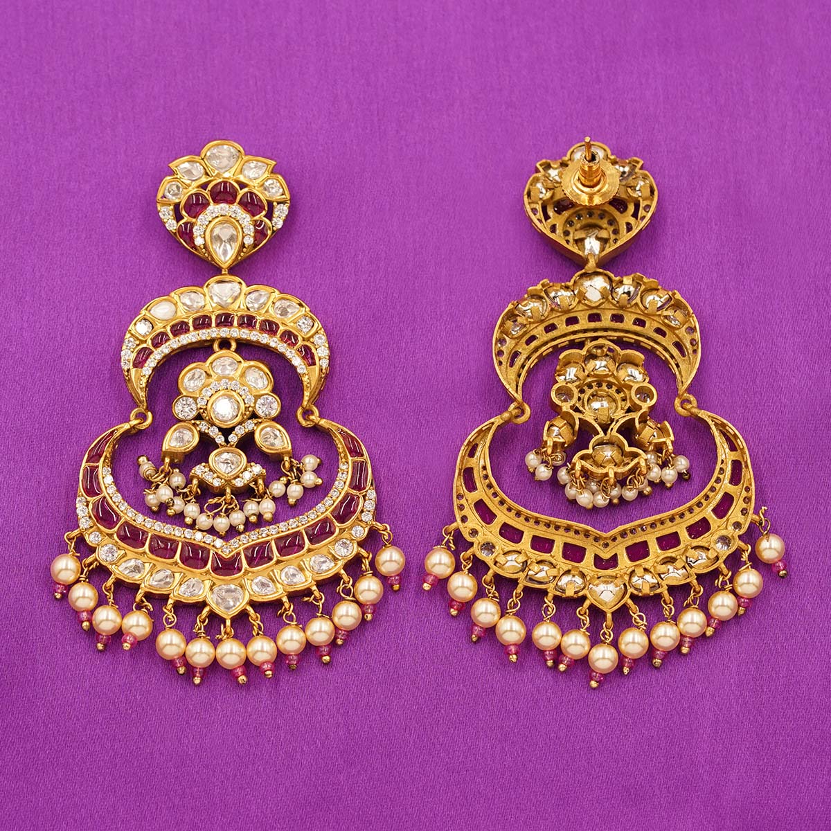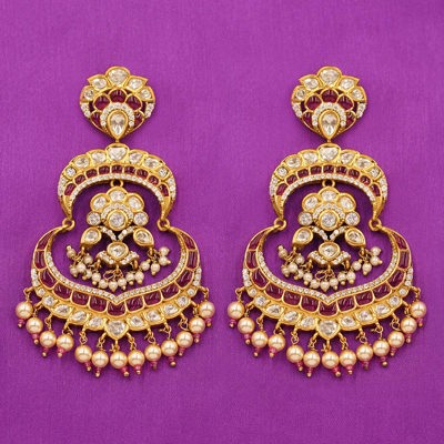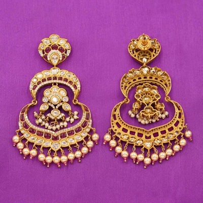 DESCRIPTION - A TOUCH OF REGAL CHARM TO YOUR ENSEMBLE WITH THESE EXQUISITELY CRAFTED KUNDAN CHANDBALI EARRINGS. FEATURING A TRADITIONAL CRESCENT SILHOUETTE, THEY ARE ADORNED WITH SHIMMERING KUNDAN STONES, RICH RUBY ACCENTS, AND DELICATE PEARL DROPS THAT SWAY BEAUTIFULLY WITH EVERY MOVEMENT. PERFECT FOR WEDDINGS, FESTIVE OCCASIONS, AND GRAND CELEBRATIONS, THESE EARRINGS BRING TOGETHER TIMELESS HERITAGE AND ELEGANT CRAFTSMANSHIP FOR A TRULY MAJESTIC LOOK.