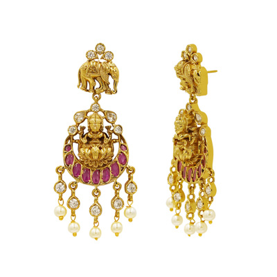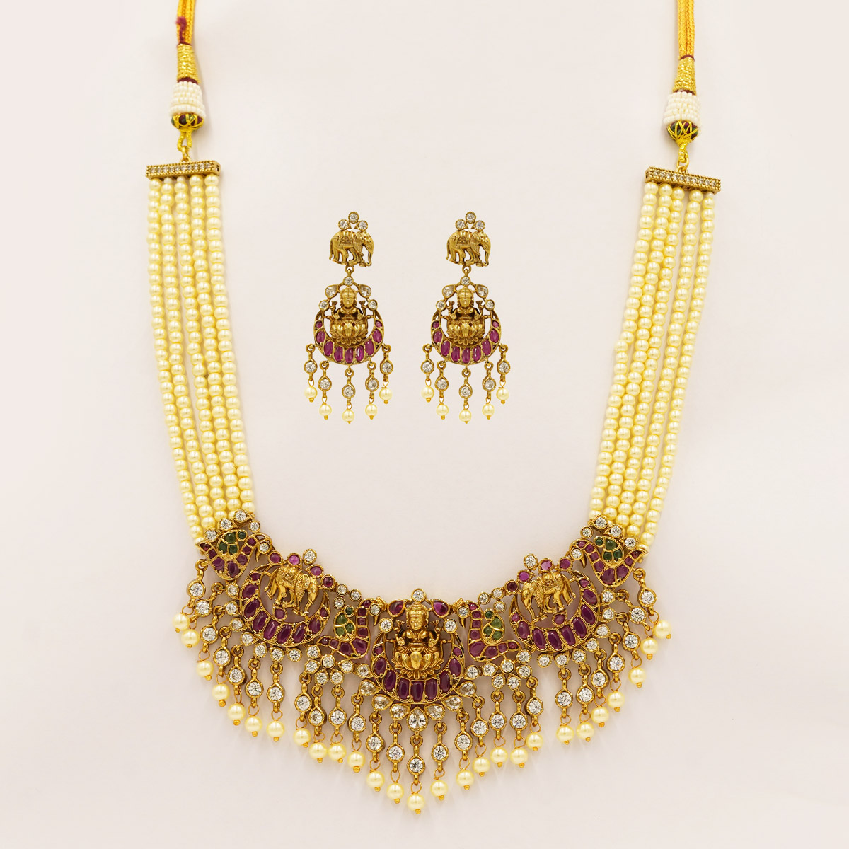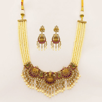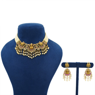 DESCRIPTION - AN EXQUISITE KUNDAN CHOKER SET CRAFTED IN A RICH GOLD TONE FINISH, ADORNED WITH TRADITIONAL PINK STONE DETAILING AND CASCADING PEARL DROPS. THE INTRICATELY DESIGNED CHOKER SITS GRACEFULLY ALONG THE NECKLINE, WHILE THE MATCHING JHUMKA-STYLE EARRINGS COMPLETE THE REGAL LOOK. PERFECT FOR WEDDINGS, FESTIVE OCCASIONS, AND BRIDAL ENSEMBLES, THIS SET BLENDS CLASSIC HERITAGE WITH TIMELESS ELEGANCE FOR A TRULY ROYAL STATEMENT.