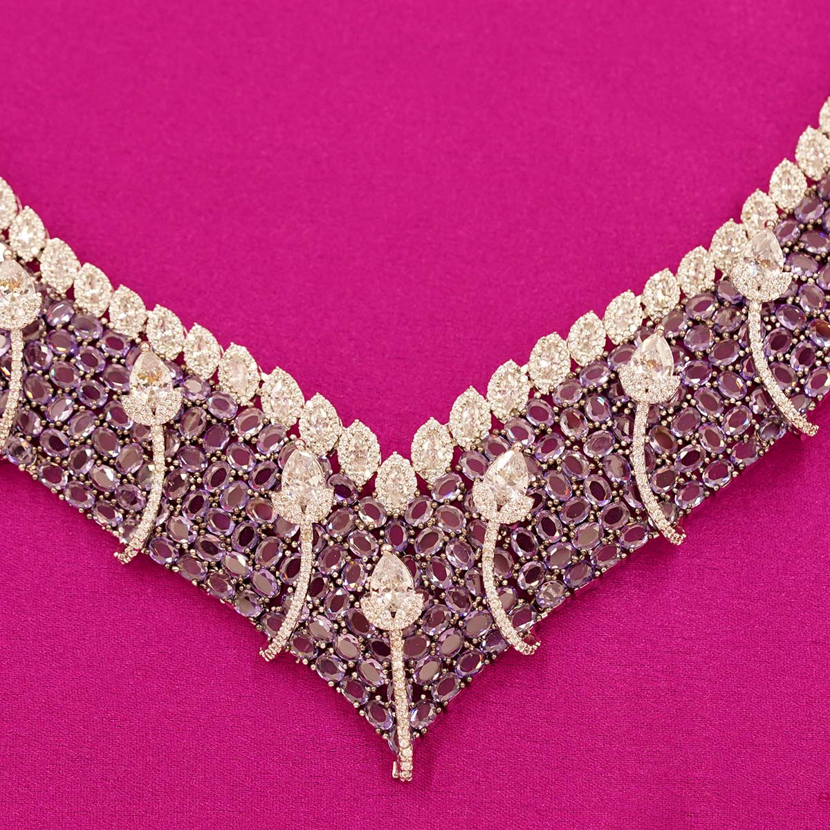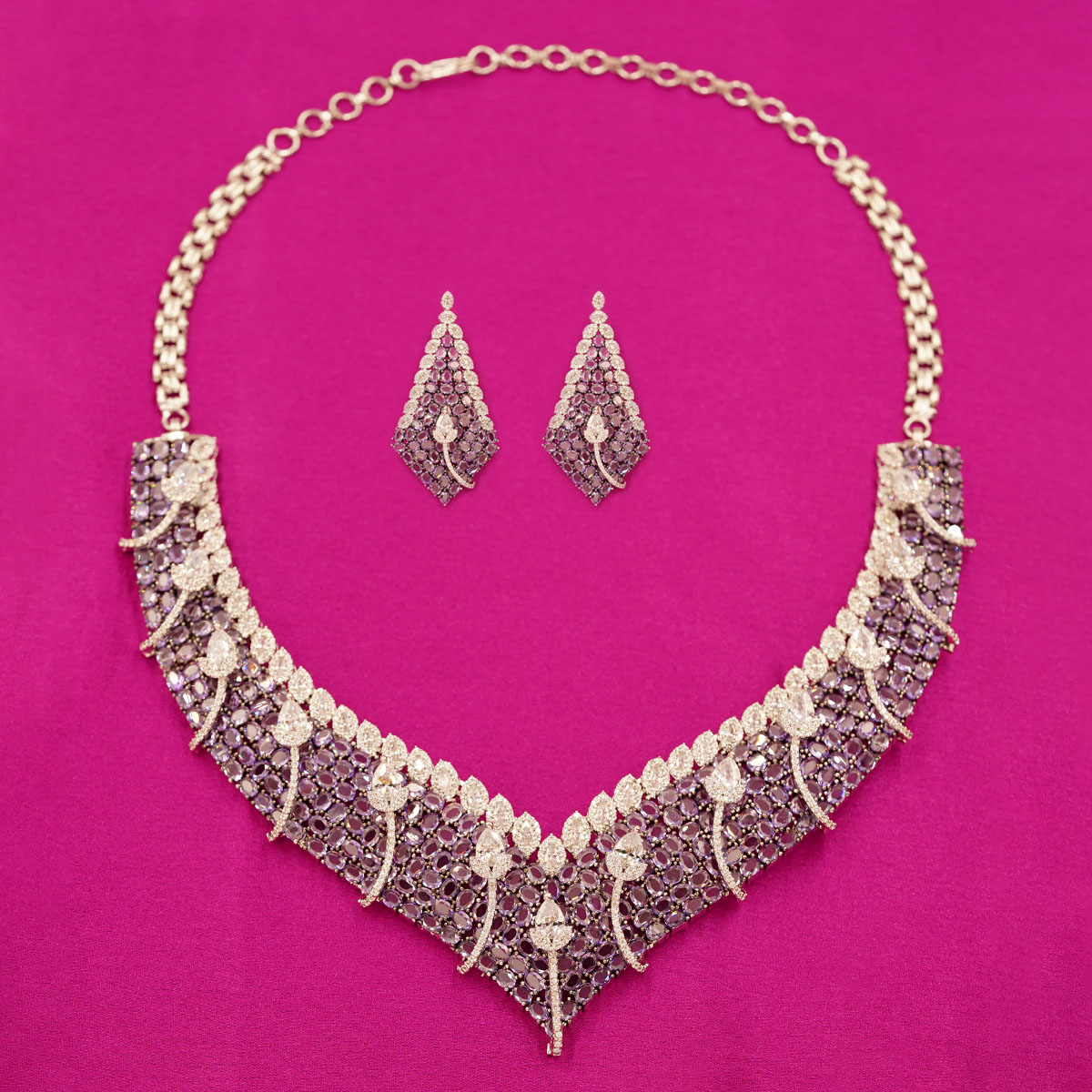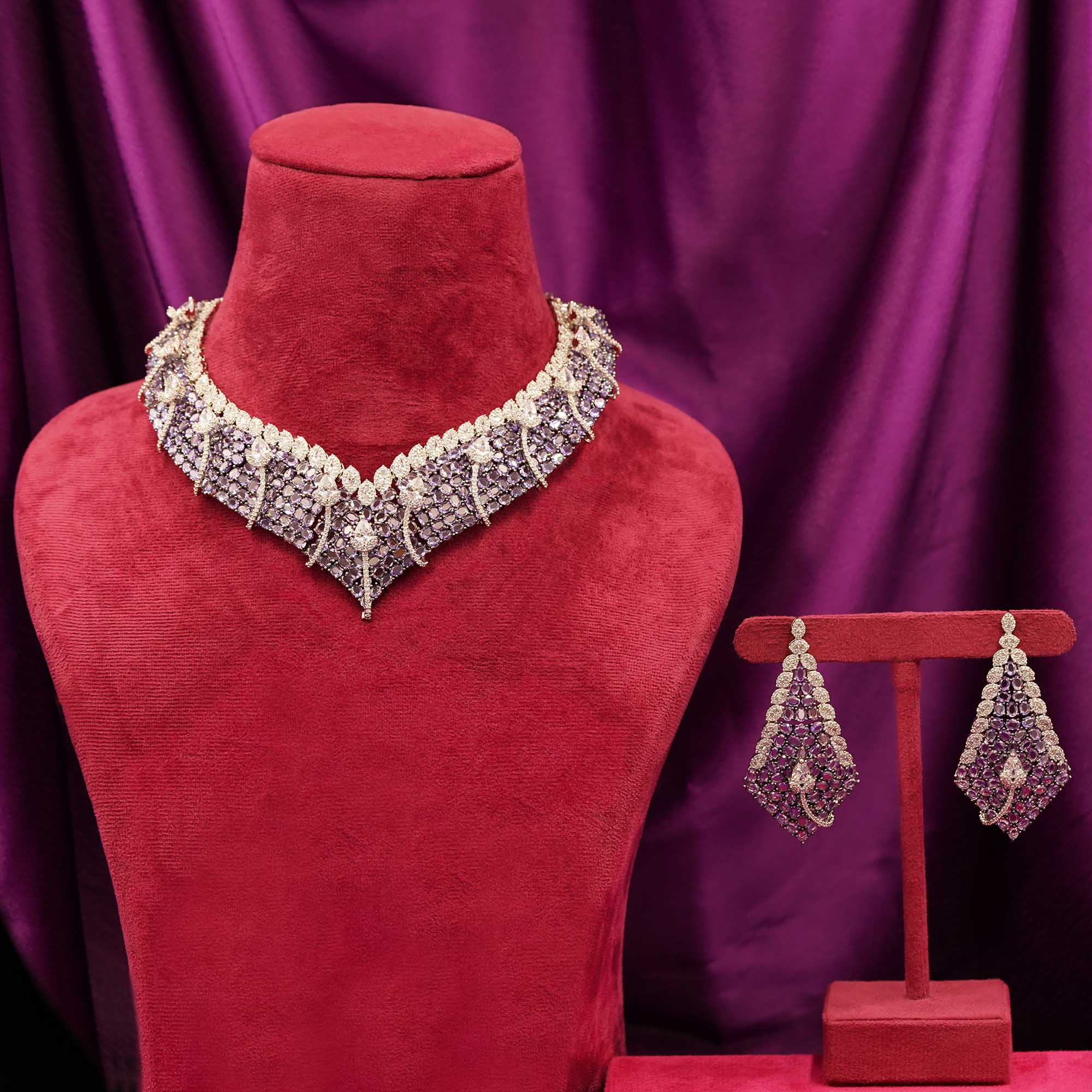DESCRIPTION - A luxurious necklace set crafted with intricate leaf motifs and shimmering stones, exuding royal elegance. The statement necklace paired with matching long earrings makes it a perfect accessory for weddings, parties, and festive celebrations.