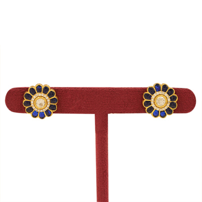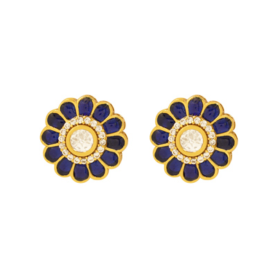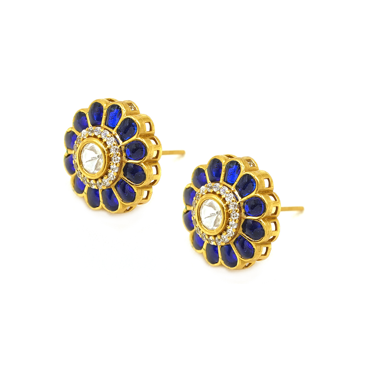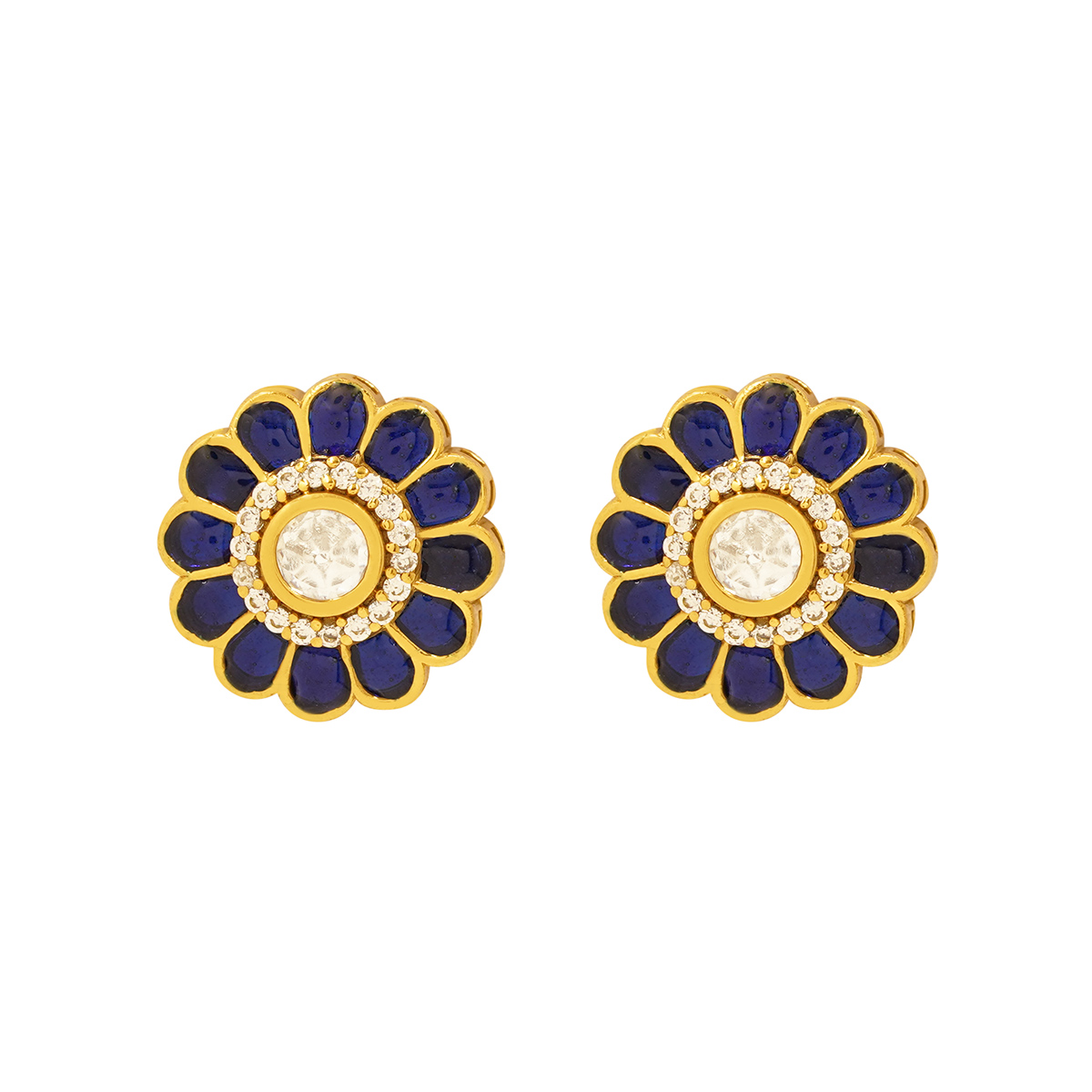 DESCRIPTION - THE ROYAL MIDNIGHT PETAL STUDS BLEND CLASSIC CHARM WITH LUXURIOUS DETAILING. DESIGNED IN A RADIANT FLORAL SHAPE, THESE STUDS FEATURE A GLEAMING GOLD-TONED CENTER SURROUNDED BY DEEP NAVY-BLUE PETAL STONES THAT CREATE A STUNNING CONTRAST. THE INTRICATE BEADWORK AROUND EACH PETAL ADDS RICHNESS, WHILE THE CIRCULAR DUAL-LAYER CENTER EVOKES TIMELESS ELEGANCE. PERFECT FOR WEDDINGS, FESTIVE WEAR, OR ELEVATING EVERYDAY OUTFITS, THESE EARRINGS BRING A REGAL YET GRACEFUL TOUCH TO ANY LOOK.