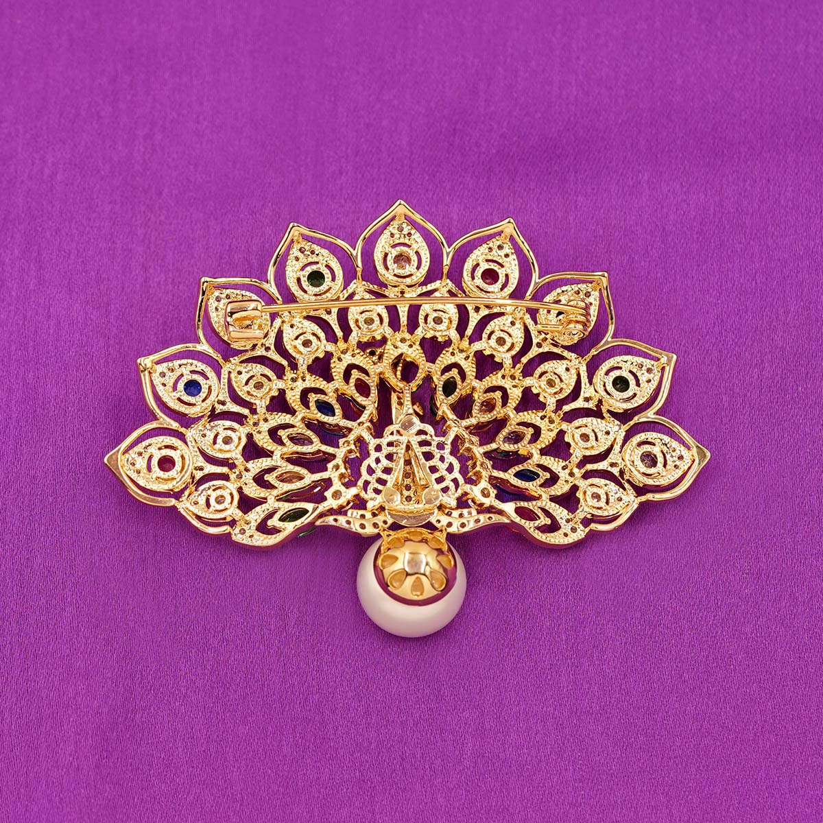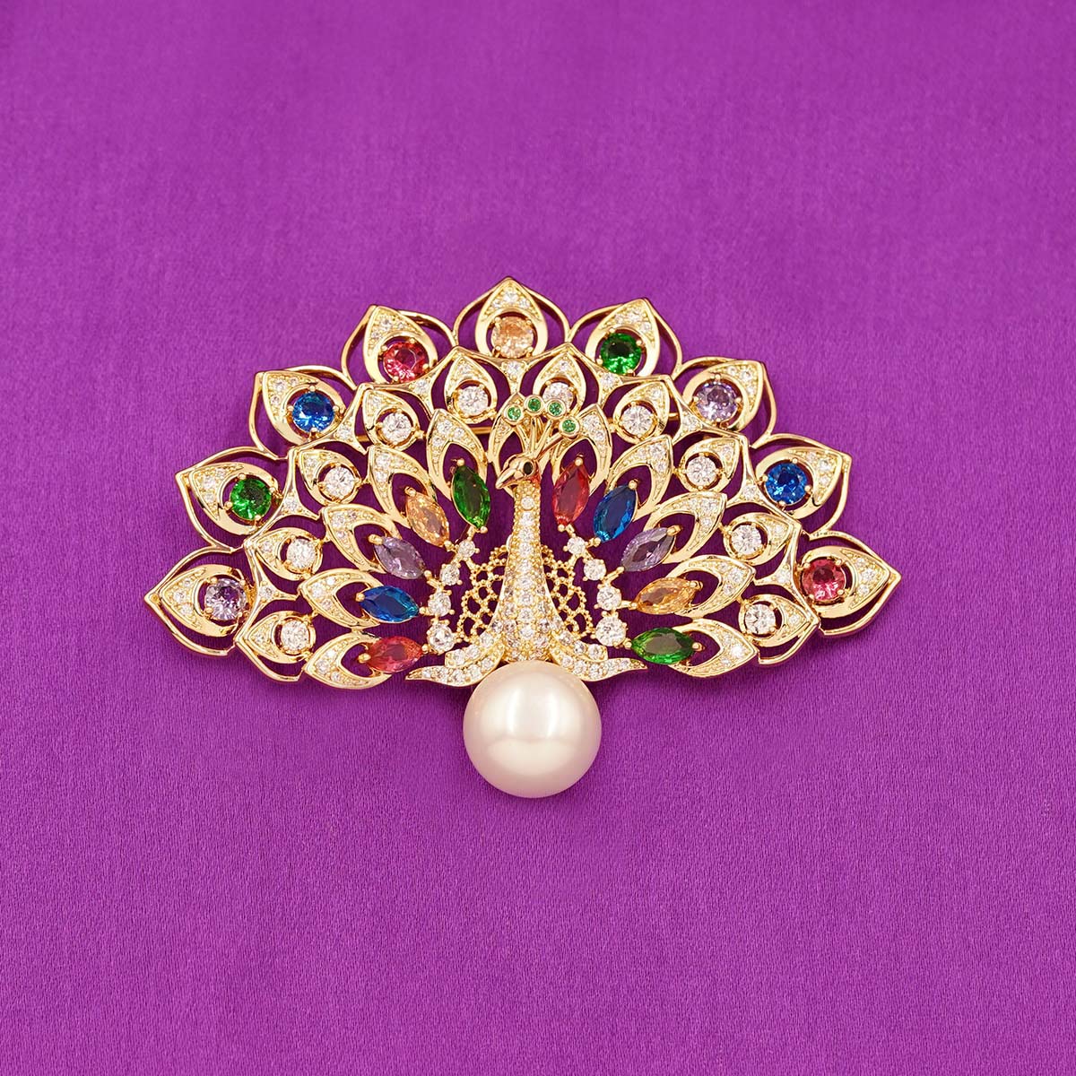 DESCRIPTION - This luxurious brooch features a magnificent peacock design, symbolizing beauty, grace, and royalty. The wide, beautifully fanned tail is adorned with multicolored gemstones in shades of green, blue, purple, and pink, each set within elegant golden feather frames. Sparkling crystals add brilliance to every detail, making the brooch shimmer from all angles.