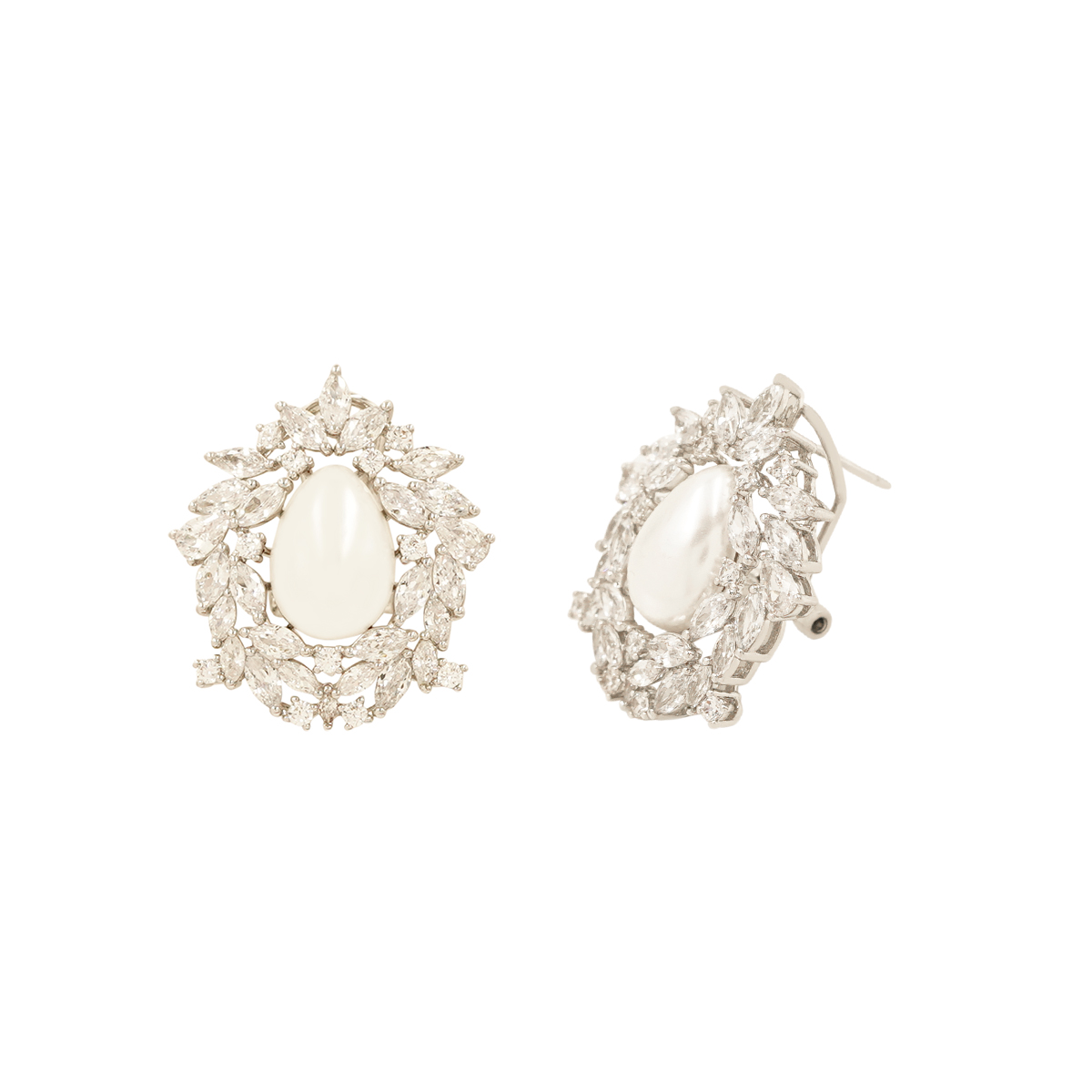 DESCRIPTION - These elegant pearl stud earrings feature a classic round pearl centerpiece surrounded by a sparkling floral halo design. Crafted in a luxurious gold-tone finish, they offer a timeless royal look perfect for weddings, festive occasions, and daily elegance. Lightweight and comfortable, these studs add a touch of grace and sophistication to any outfit, making them an ideal gift for women and girls who love classy jewelry.