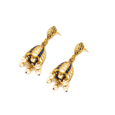 DESCRIPTION - ELEVATE YOUR TRADITIONAL LOOK WITH THESE EXQUISITELY CRAFTED ROYAL POLKI DROP EARRINGS. FEATURING A FLORAL-INSPIRED STUD TOP AND AN ELEGANT DOME-SHAPED DROP, THESE EARRINGS ARE ADORNED WITH SHIMMERING POLKI-STYLE STONES, DEEP ROYAL BLUE ENAMEL ACCENTS, AND LUSTROUS PEARL DROPS. THE INTRICATE GOLD-TONED DETAILING ADDS A TOUCH OF REGAL CHARM, MAKING THEM PERFECT FOR WEDDINGS, FESTIVE OCCASIONS, AND GRAND CELEBRATIONS. A TIMELESS STATEMENT PIECE THAT BLENDS HERITAGE ARTISTRY WITH REFINED ELEGANCE.