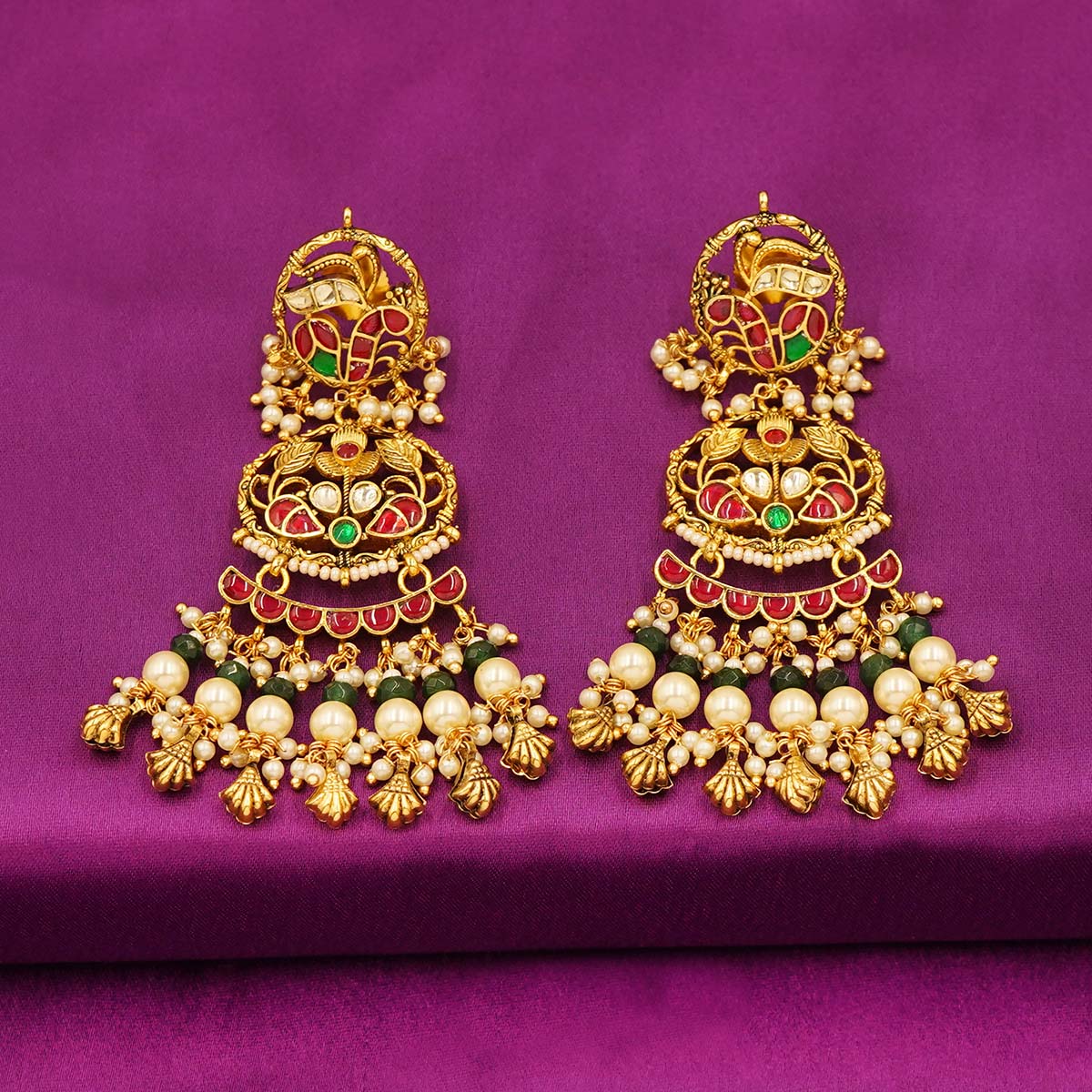 Royal Red & Green Kundan Pearl Long Jhumka Earrings