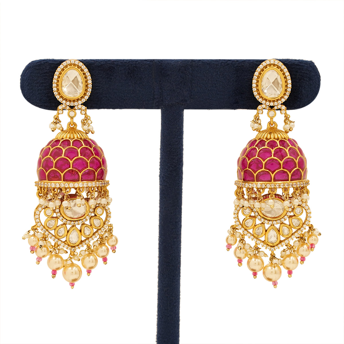 Royal Ruby Jhumka Earrings with Kundan & Pearl Drops