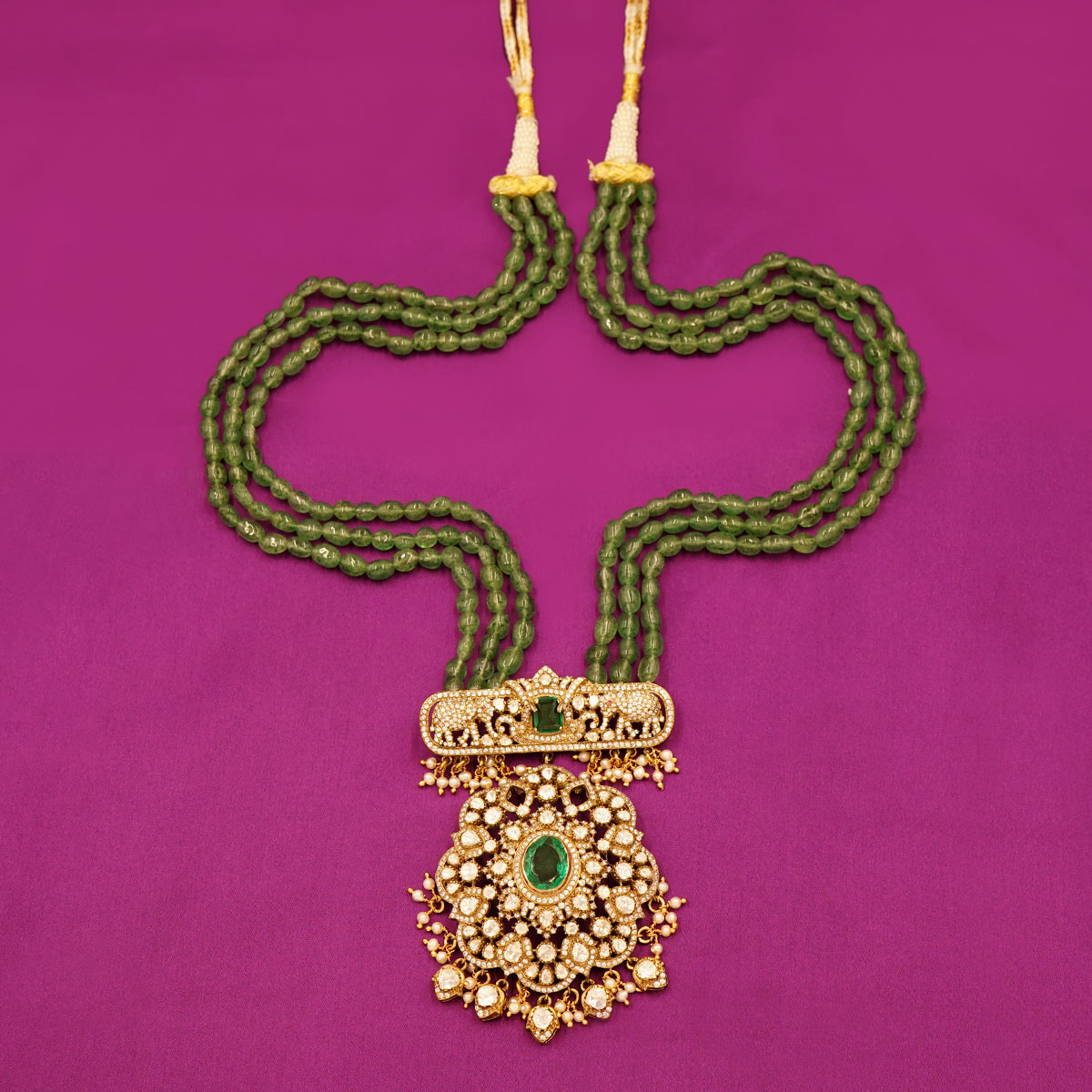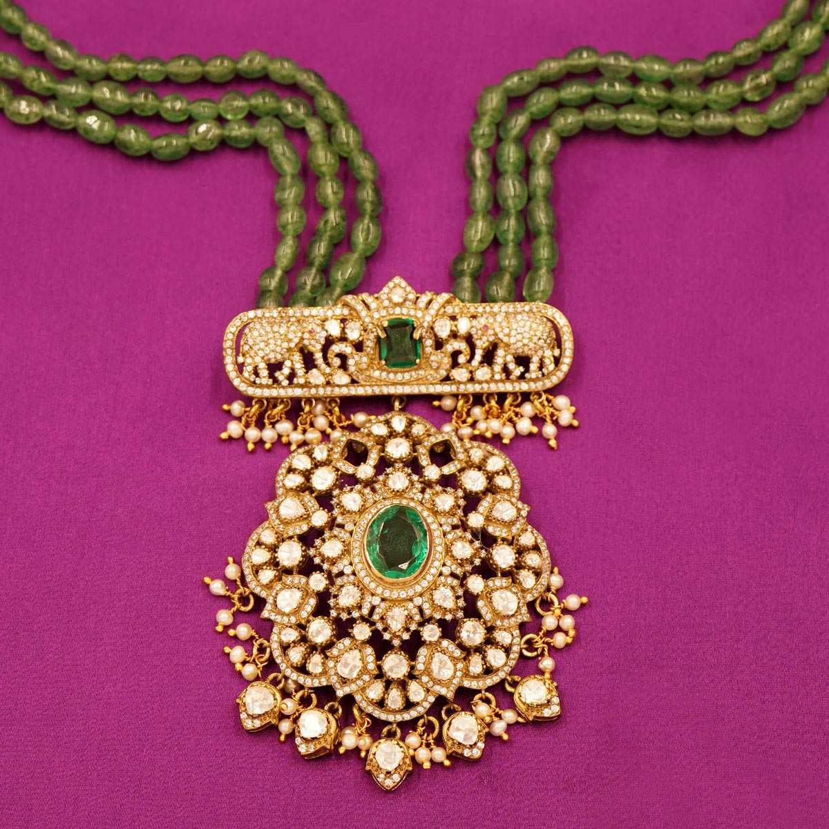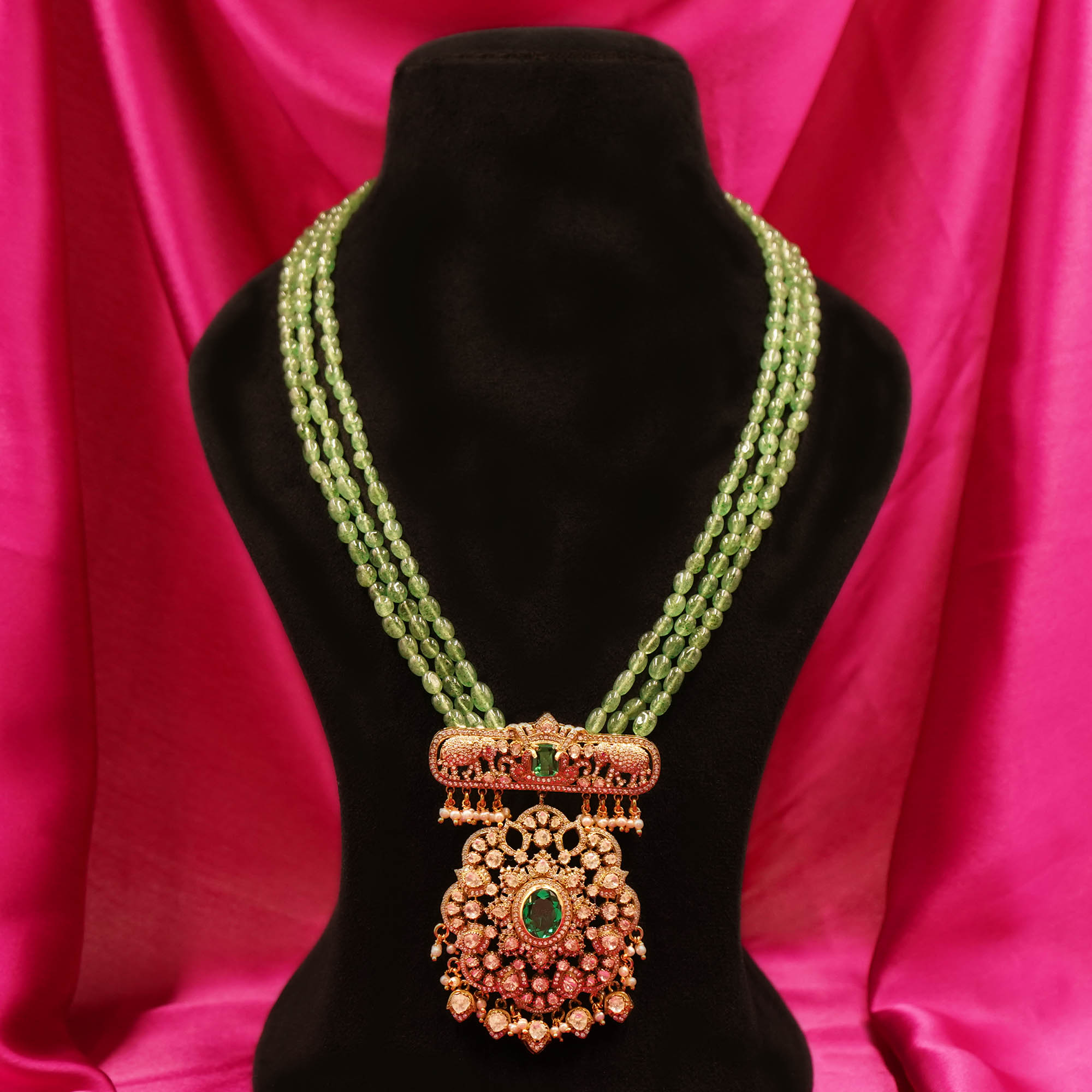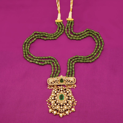 Royal Temple Design Silver Necklace with Green Beads