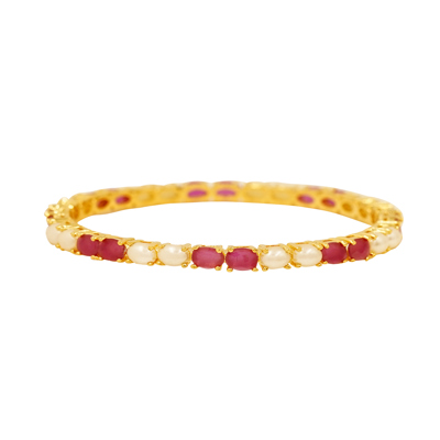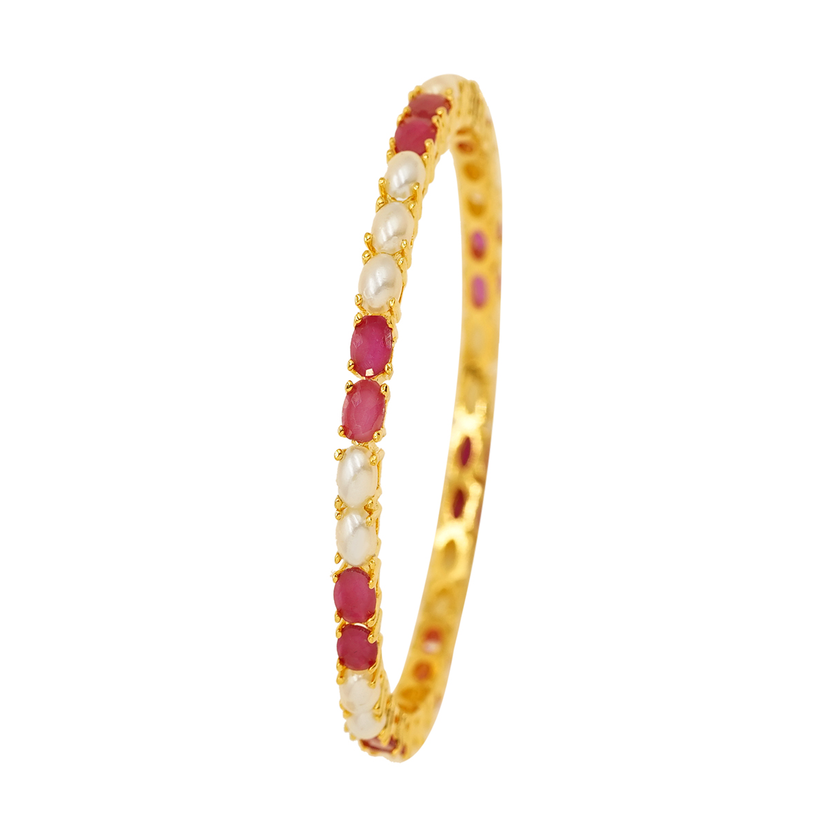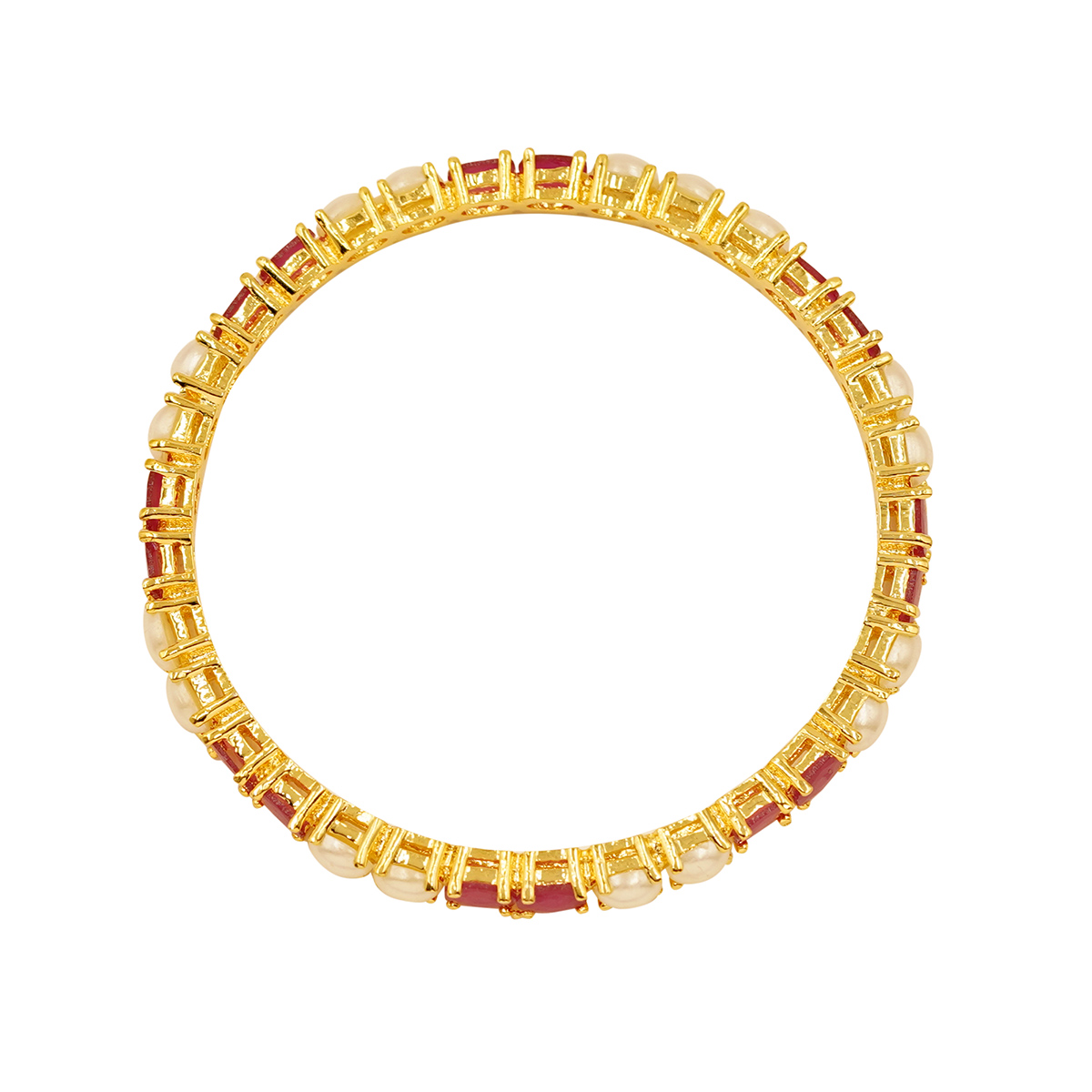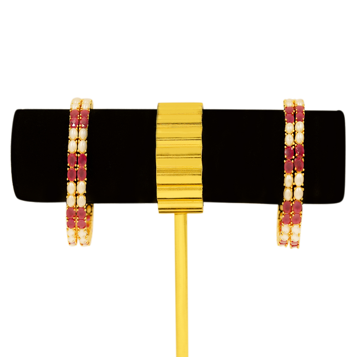 DESCRIPTION - THE ITEMS IN THE IMAGE ARE GOLD-PLATED BANGLES FOR WOMEN, ADORNED WITH ALTERNATING ROWS OF RUBY (RED) AND PEARL (WHITE) COLORED STONES OR BEADS. THESE BANGLES OFTEN FEATURE AN INTRICATE FLORAL OR LATTICE DESIGN AND A TEXTURED FINISH, PROVIDING A BLEND OF TRADITIONAL ARTISTRY AND CONTEMPORARY ELEGANCE.