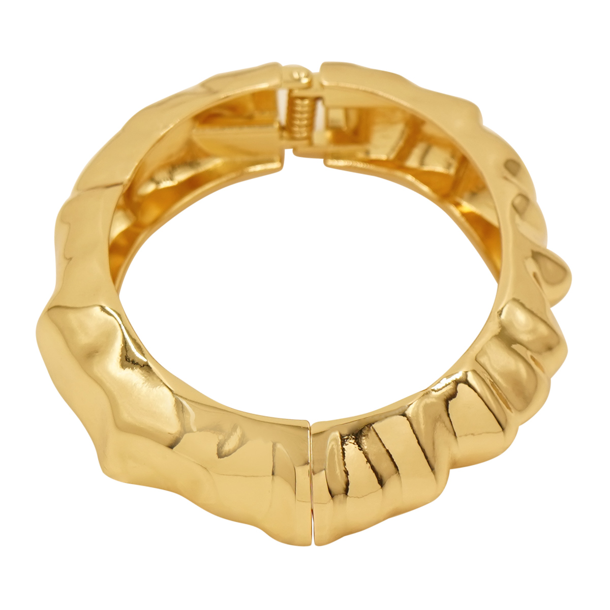 DESCRIPTION - A chunky, gold-tone bangle with a distinctive sculptural design. The bracelet features an articulated, hinged clasp for easy wear. Its highly polished finish and irregular, ridged surface give it a unique, contemporary look that mimics the texture of natural bamboo. This piece is a bold statement accessory.