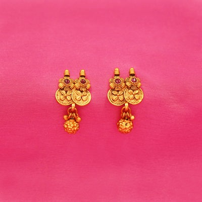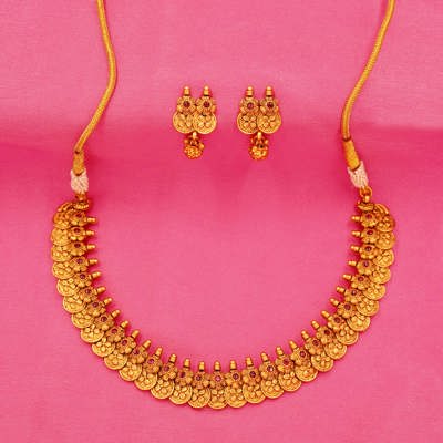DESCRIPTION - NECKLACE SET/SHORT NECKLACE SET, A TRADITIONAL INDIAN JEWELRY SET CONSISTING OF A NECKLACE AND MATCHING EARRINGS. A TRADITIONAL INDIAN JEWELRY SET CONSISTING OF A NECKLACE AND MATCHING EARRINGS. THE SET IS INTRICATELY DESIGNED IN ANTIQUE GOLD TONE, ADORNED WITH SMALL RED STONES EMBEDDED INTO FLORAL AND CIRCULAR PATTERNS.