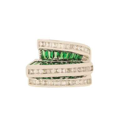 DESCRIPTION - This modern band ring features a striking wave design enhanced with shimmering baguette crystals and a bold green stone centerpiece. Its unique, flowing silhouette makes it a stylish statement accessory for everyday elegance or special occasions.