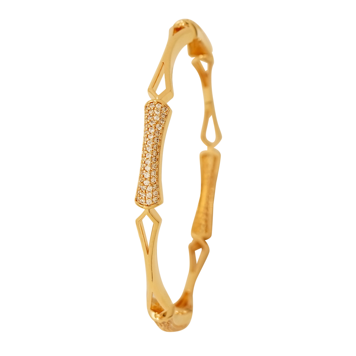 DESCRIPTION - This elegant bangle pair features a modern segmented design, highlighted with sparkling micro-studded stone panels for a refined touch. Finished in a premium gold-tone, these bangles offer a perfect blend of style, shine, and comfort. Ideal for festive wear, parties, or everyday elegance, this pair adds a classy and contemporary charm to any outfit.