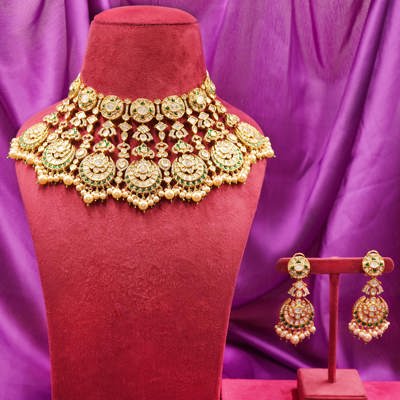 DESCRIPTION - KUNDAN NECKLACE SET/ necklace set/ Regal Kundan Necklace Set with Maang Tikka Elevate your bridal elegance with this magnificent Kundan bridal necklace set, crafted to perfection. Set against a lustrous pink backdrop, this exquisite piece features a grand choker-style necklace adorned with intricate Kundan work