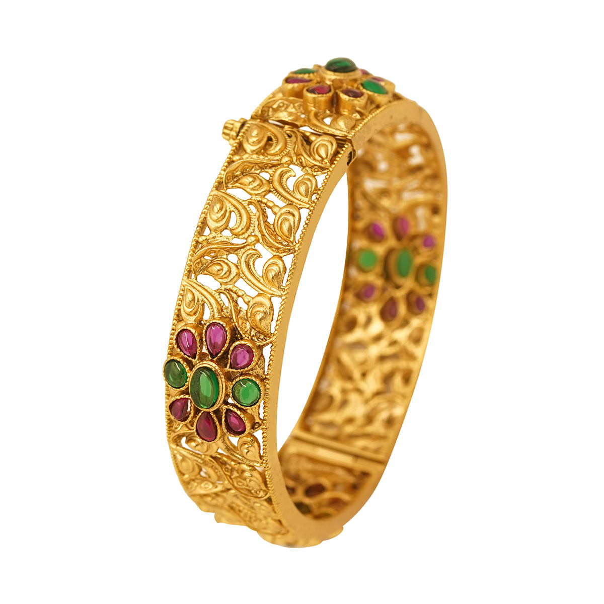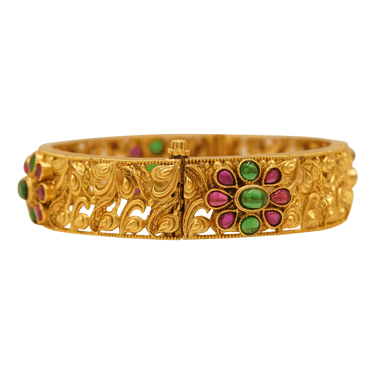 DESCRIPTION - FEATURING AN INTRICATE TRADITIONAL INDIAN DESIGN. THEY HAVE AN ANTIQUE OR MATTE FINISH AND ARE EMBELLISHED WITH SMALL RED AND GREEN STONES, LIKELY RUBIES AND EMERALDS OR THEIR CUBIC ZIRCONIA (CZ) SIMULANTS. THE DESIGN INCORPORATES DETAILED FLORAL.