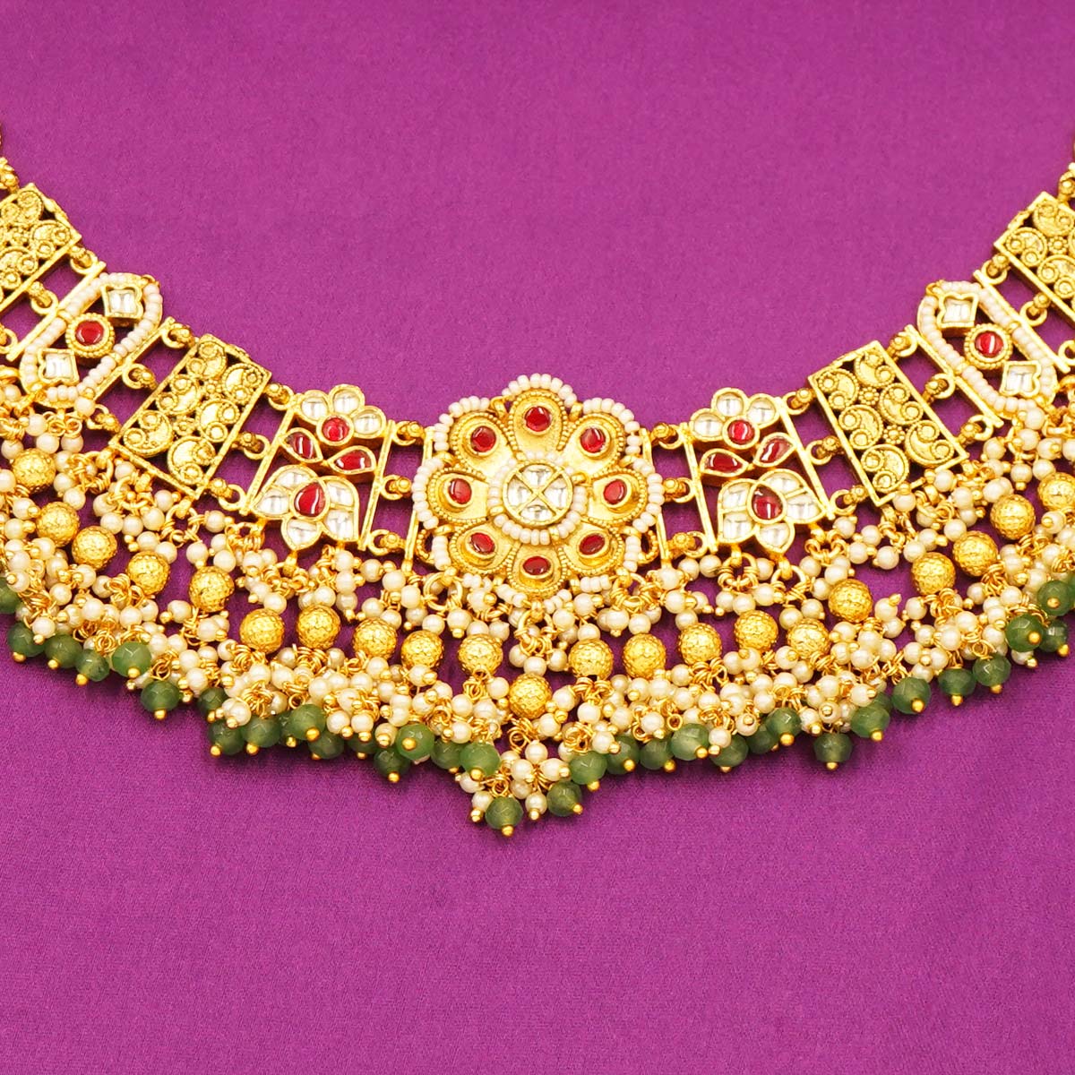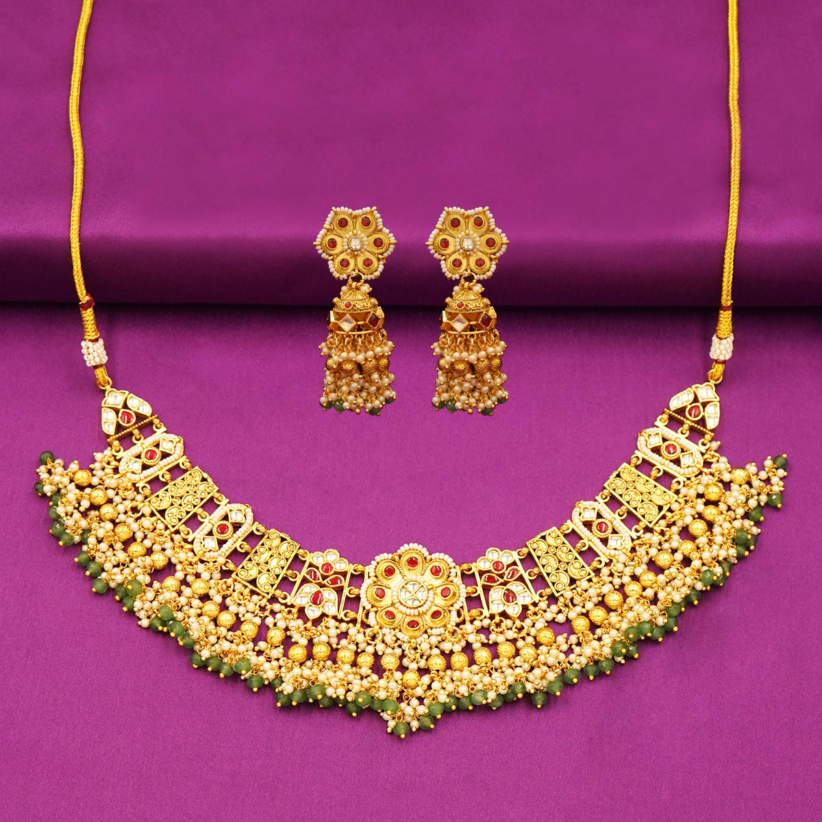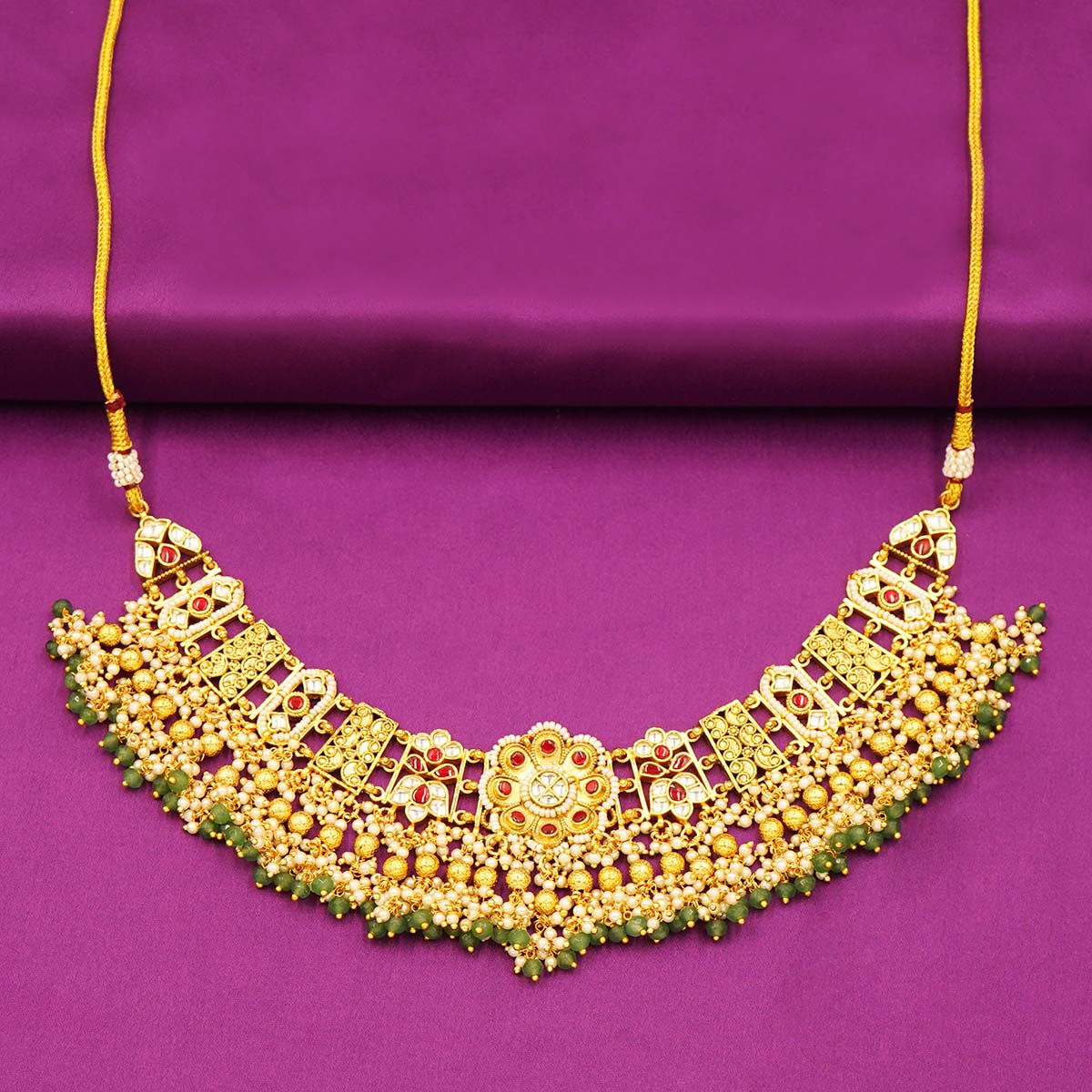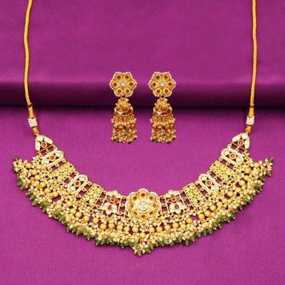DESCRIPTION - Step into timeless tradition with this Traditional Kundan & Beaded Choker Necklace Set, a perfect blend of royal craftsmanship and modern grace. The choker features intricate Kundan work, golden floral motifs, and layered bead detailing with hints of green — making it a luxurious piece for bridal or festive occasions.