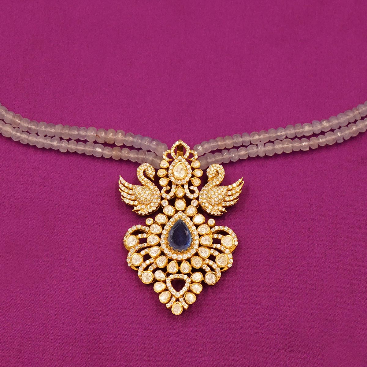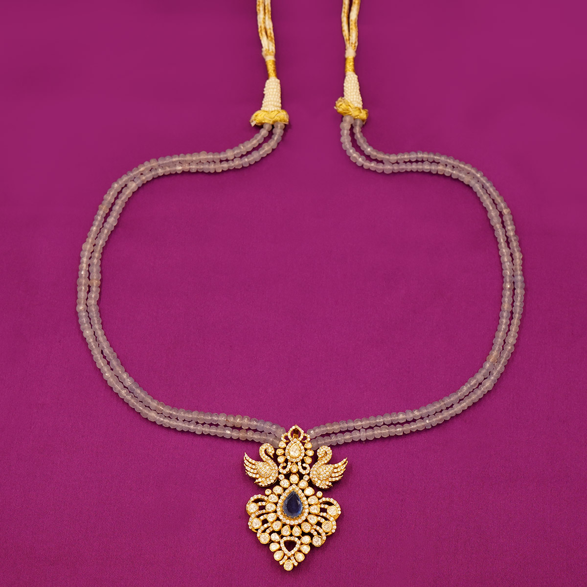 DESCRIPTION - Adorn yourself with this elegant silver necklace featuring a royal peacock motif pendant, highlighted with sparkling white stones and a striking blue centerpiece. The intricate craftsmanship, combined with double-layered translucent stone beads, makes this piece perfect for weddings, festive occasions, and cultural celebrations. A timeless blend of tradition and grace, this necklace is designed to complement both ethnic and contemporary outfits.