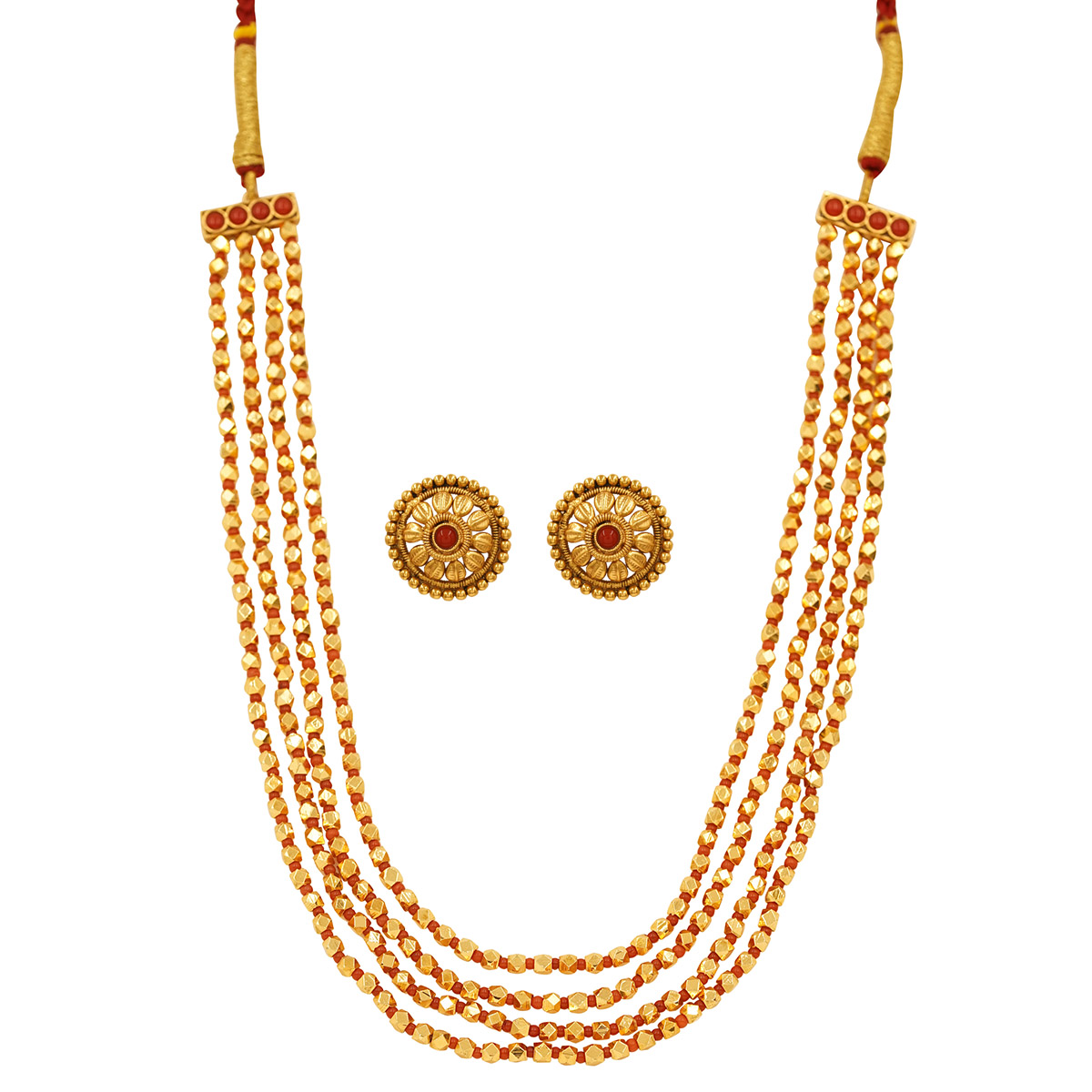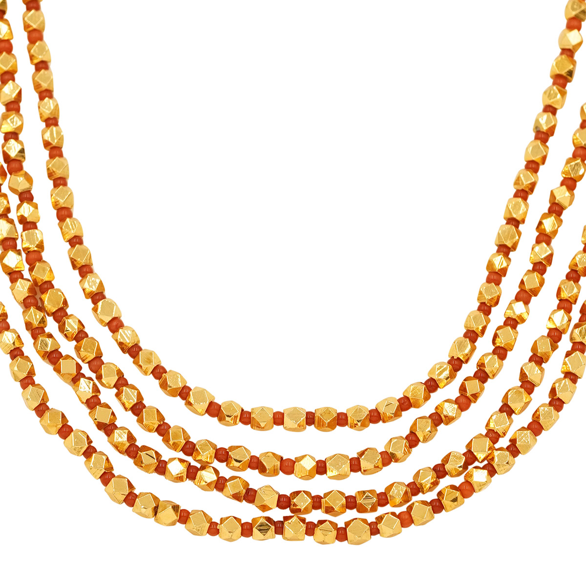 DESCRIPTION - A beautifully designed triple-layer necklace set featuring faceted golden beads that reflect light with every move. Lightweight and versatile, this set adds a refined charm to any ethnic ensemble.