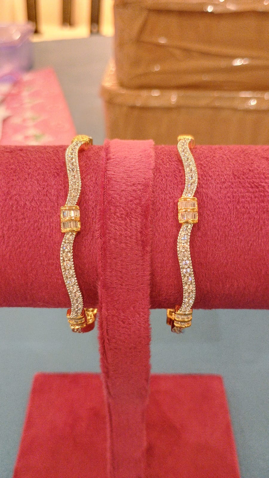 DESCRIPTION - This stylish bangle pair features a unique wavy design accented with sparkling baguette-cut CZ stones at the center. The sides are lined with shimmering micro CZs, giving it a premium and graceful look. Lightweight, comfortable, and beautifully finished, this pair is perfect for both daily wear and festive occasions.