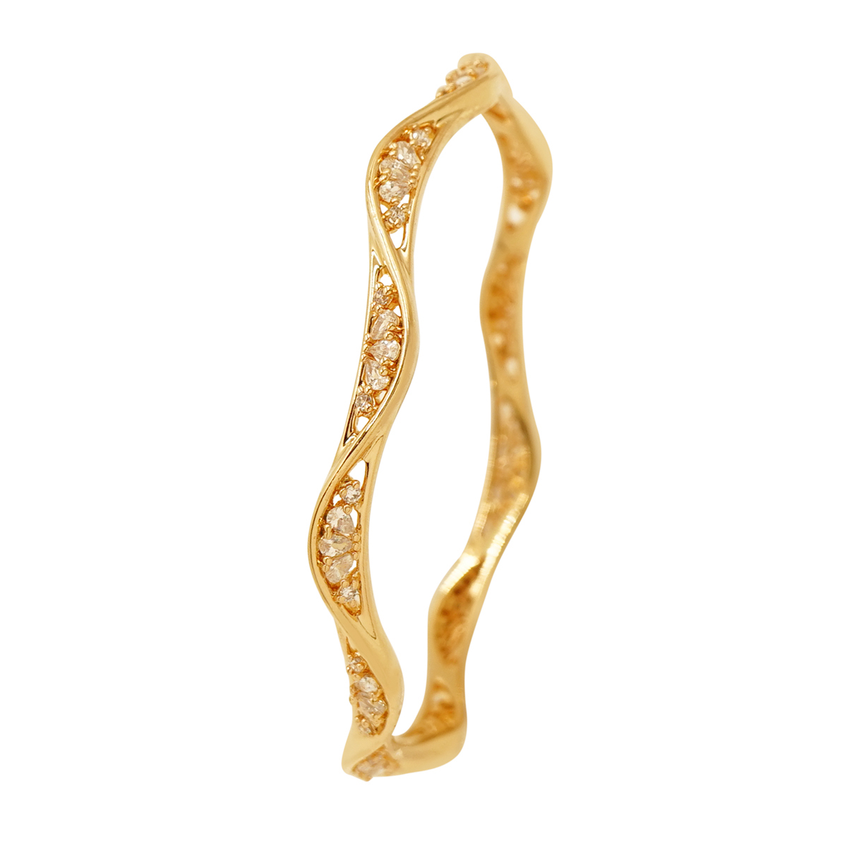 DESCRIPTION - This stylish bangle pair features a unique wavy design adorned with sparkling stones that add a graceful shimmer from every angle. these bangles are lightweight, elegant, and perfect for both daily wear and special occasions. A chic and modern addition to your jewellery collection, offering a blend of simplicity and sparkle.
