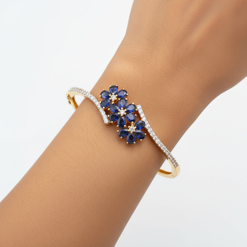 DESCRIPTION - This charming gold-tone bracelet features a graceful design with a central cluster of deep blue floral motifs accented by sparkling crystals. The curved, crystal-studded band adds sophistication, making it a perfect accessory for weddings, festive events, and elegant evening wear.