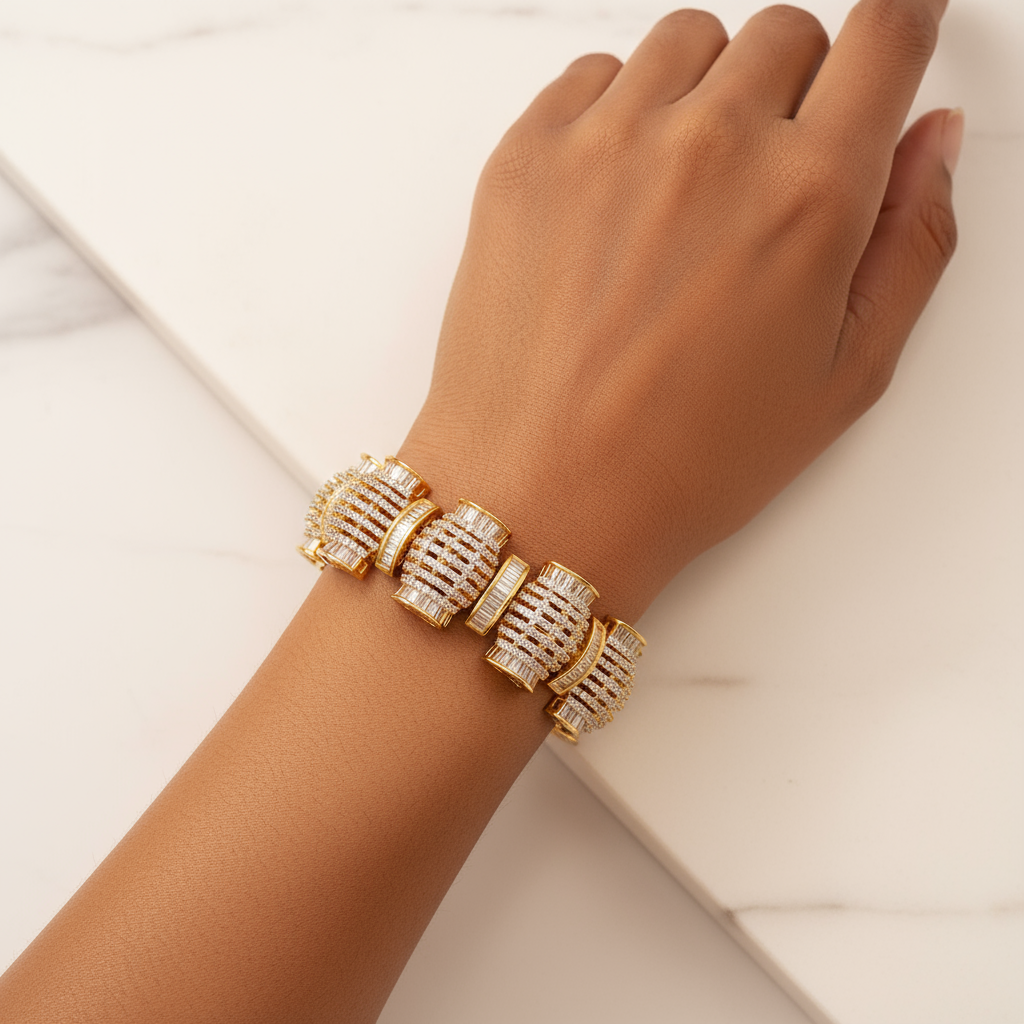 DESCRIPTION - A premium gold-finish bracelet featuring elegant dome-shaped segments adorned with sparkling cubic zirconia and baguette stones. Stylish, modern, and perfect for parties, weddings, and special occasions.