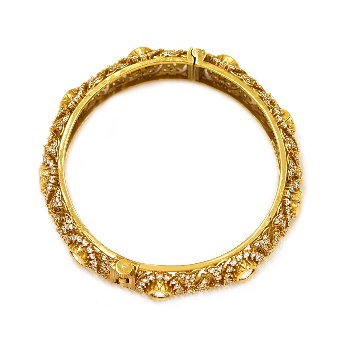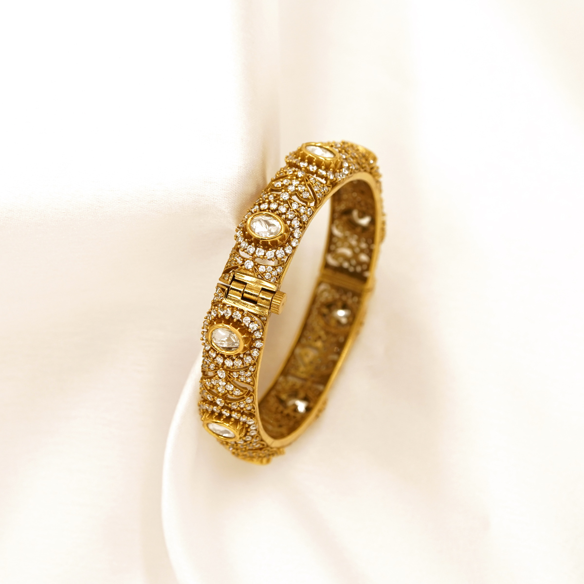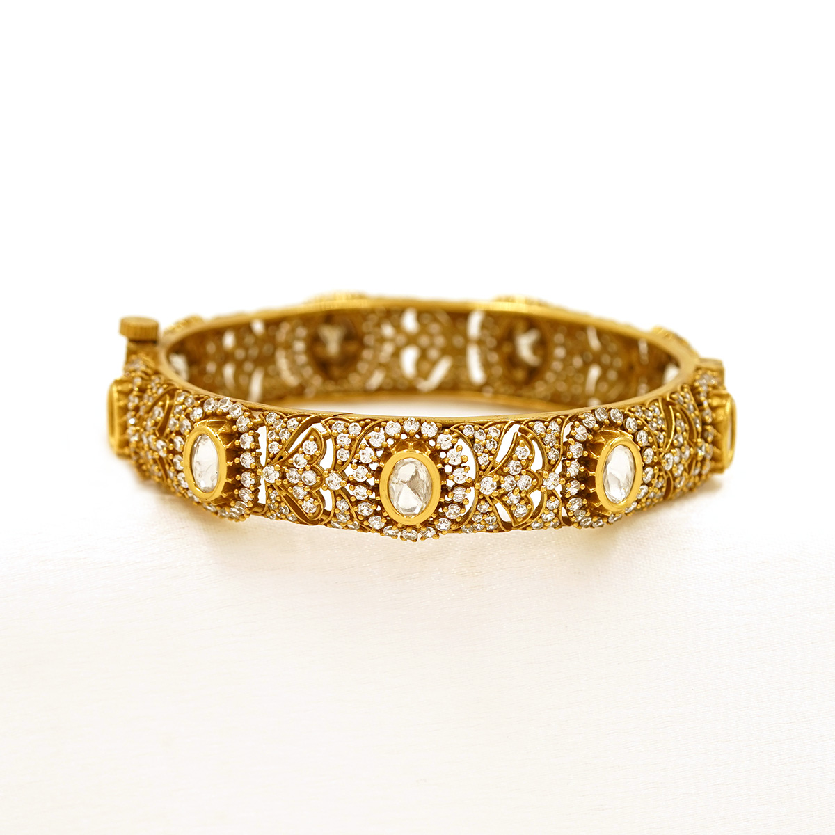 DESCRIPTION - THIS ELEGANT TEMPLE-STYLE GOLD TONE BANGLE SHOWCASES EXQUISITE CRAFTSMANSHIP WITH DETAILED FLORAL AND ANTIQUE-INSPIRED PATTERNS. DESIGNED TO REFLECT TIMELESS INDIAN HERITAGE, THE BANGLE FEATURES A RICH, TEXTURED FINISH THAT ADDS DEPTH AND BRILLIANCE TO EVERY CURVE. PERFECT FOR WEDDINGS, FESTIVE OCCASIONS, AND TRADITIONAL ATTIRE, THIS STATEMENT PIECE BLENDS CLASSIC ARTISTRY WITH LUXURIOUS APPEAL. WEAR IT SOLO FOR A BOLD LOOK OR PAIR IT WITH MATCHING BANGLES FOR A COMPLETE TRADITIONAL ENSEMBLE.