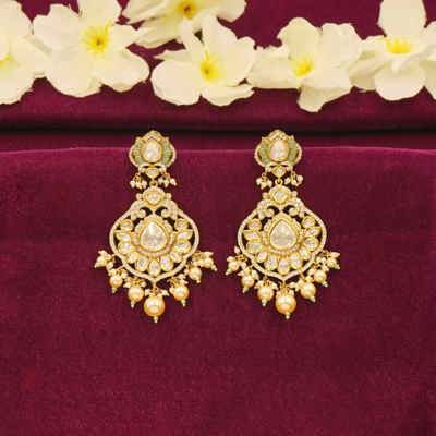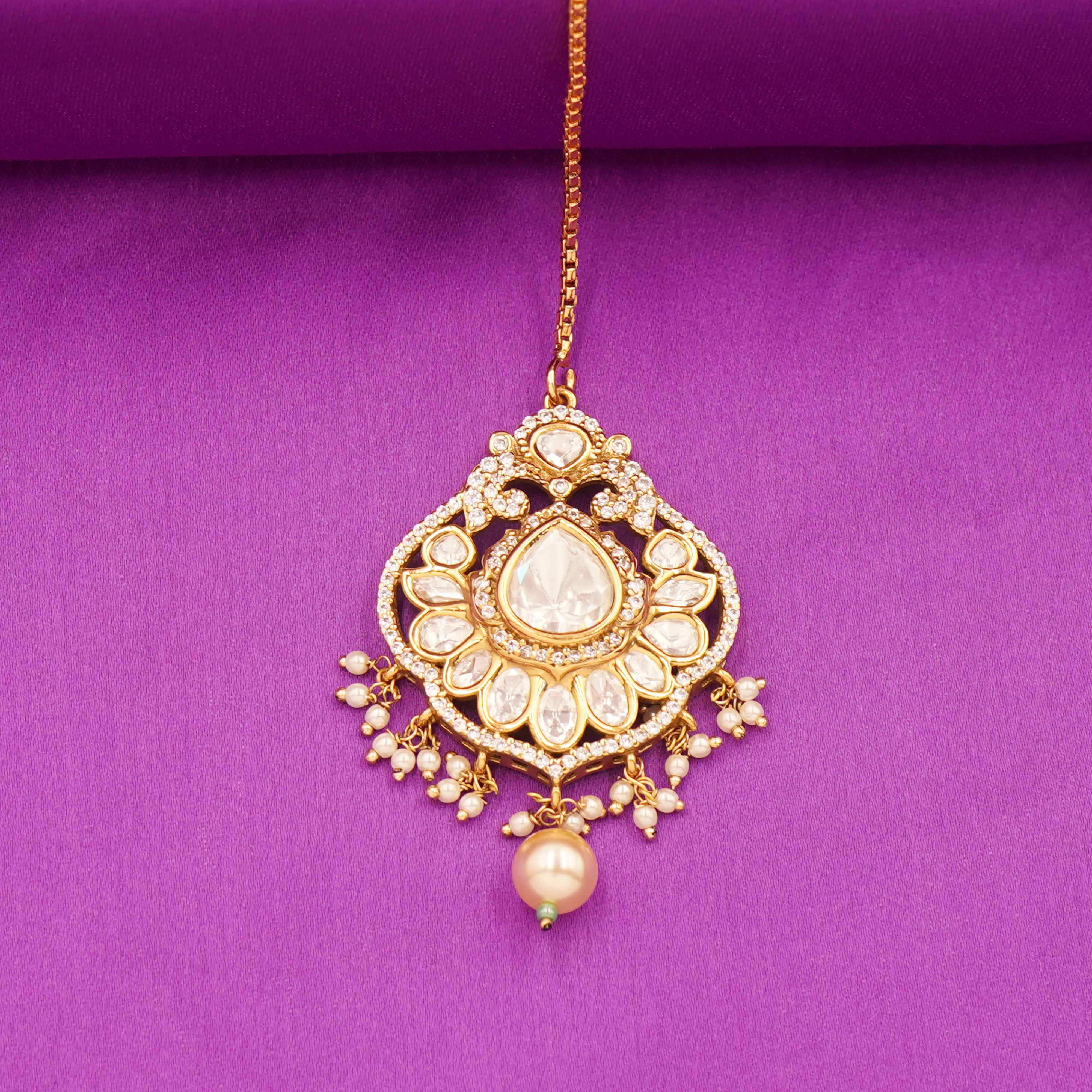 DESCRIPTION - Kundan Necklace Set / Choker Set / White Kundan Pearl Necklace Set Make a majestic statement with this White Kundan Necklace set, featuring an ornate gold-toned necklace, coordinating chandbali earrings, and a beautifully crafted maang tikka. The intricate design showcases heart-shaped Kundan stones, elegant pearl drops, and traditional Indian craftsmanship, creating a look of opulence and timeless grace.