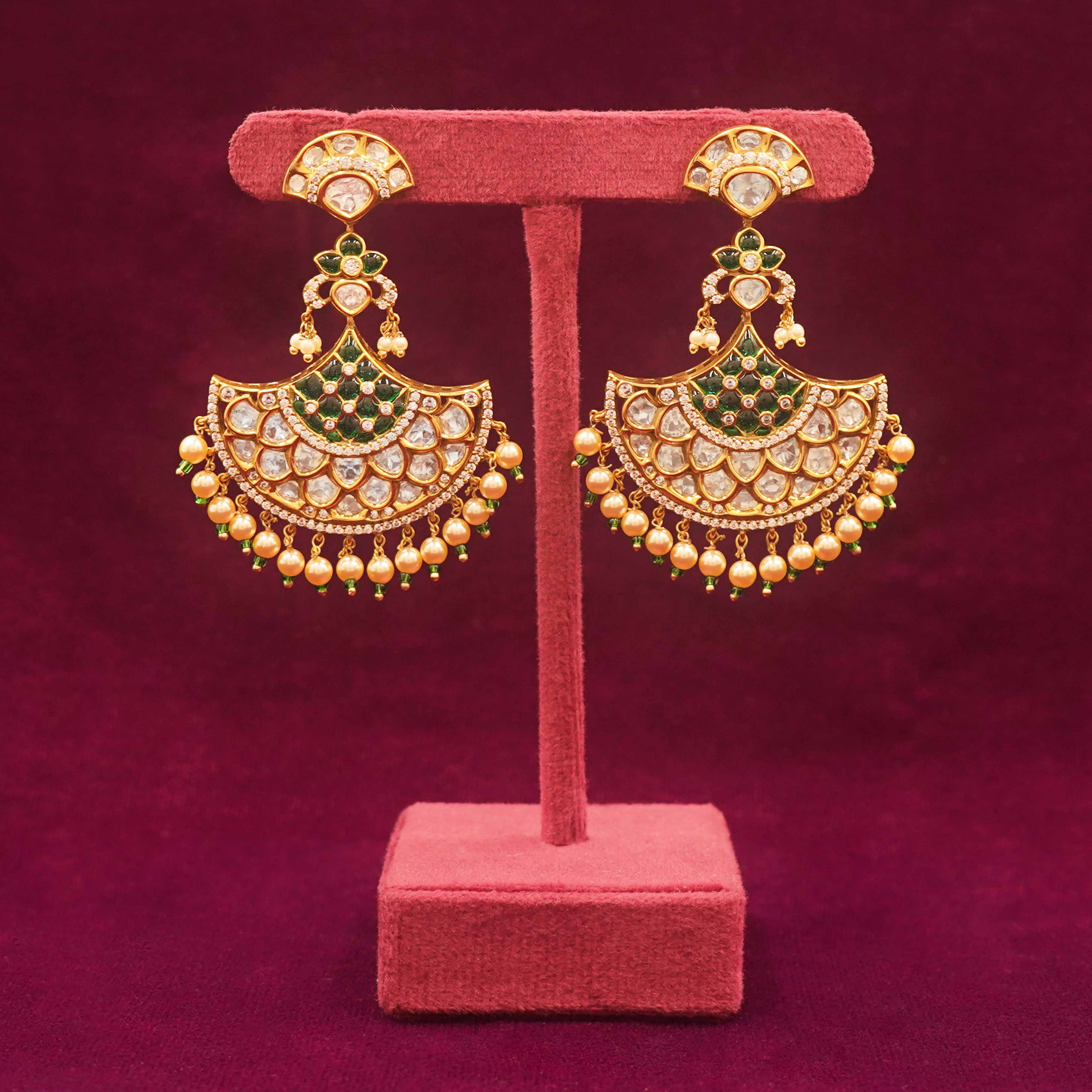 DESCRIPTION - Kundan Earring / Earring / Green & Pearl Drop Chandbali Earrings Add a graceful ethnic flair to your look with these green and pearl drop chandbali earrings, designed with exquisite floral detailing and shimmering accents. Ideal for festive occasions, weddings, or special celebrations, these artificial earrings are lightweight and comfortable, yet rich in craftsmanship and style.