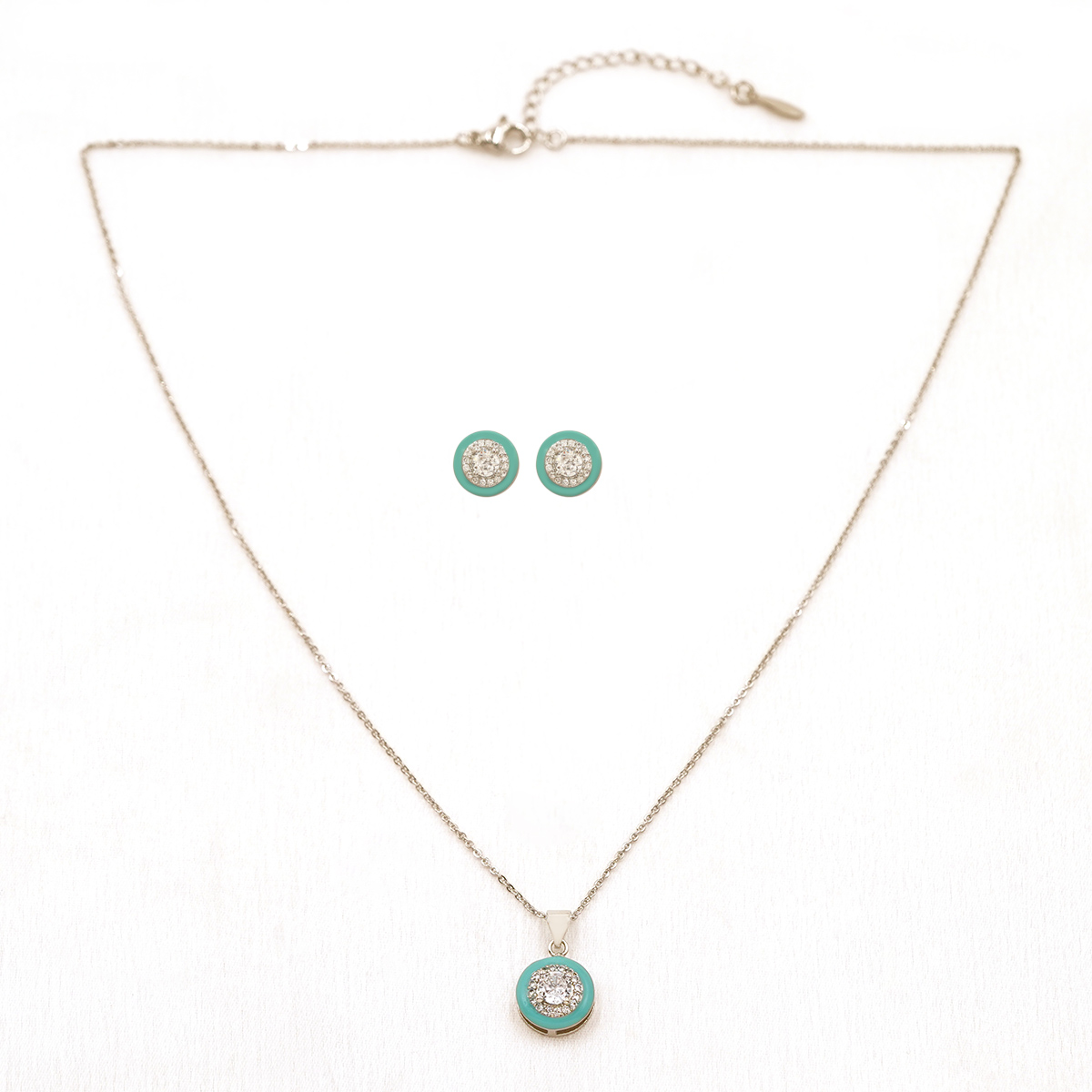 DESCRIPTION - ADD A TOUCH OF SERENE ELEGANCE TO YOUR COLLECTION WITH THIS GRACEFUL AQUA HALO PENDANT NECKLACE SET, PAIRED WITH MATCHING STUD EARRINGS. FEATURING SOFT AQUA-TONED STONES ENCIRCLED BY SPARKLING CRYSTAL ACCENTS, THIS SET OFFERS A PERFECT BALANCE OF SUBTLE COLOR AND REFINED SHINE. THE DELICATE SILVER-TONED CHAIN ENHANCES THE PENDANT’S CHARM, MAKING IT IDEAL FOR EVERYDAY ELEGANCE AS WELL AS SPECIAL OCCASIONS. A TIMELESS CHOICE FOR GIFTING OR ELEVATING YOUR OWN JEWELRY WARDROBE WITH EFFORTLESS SOPHISTICATION.
