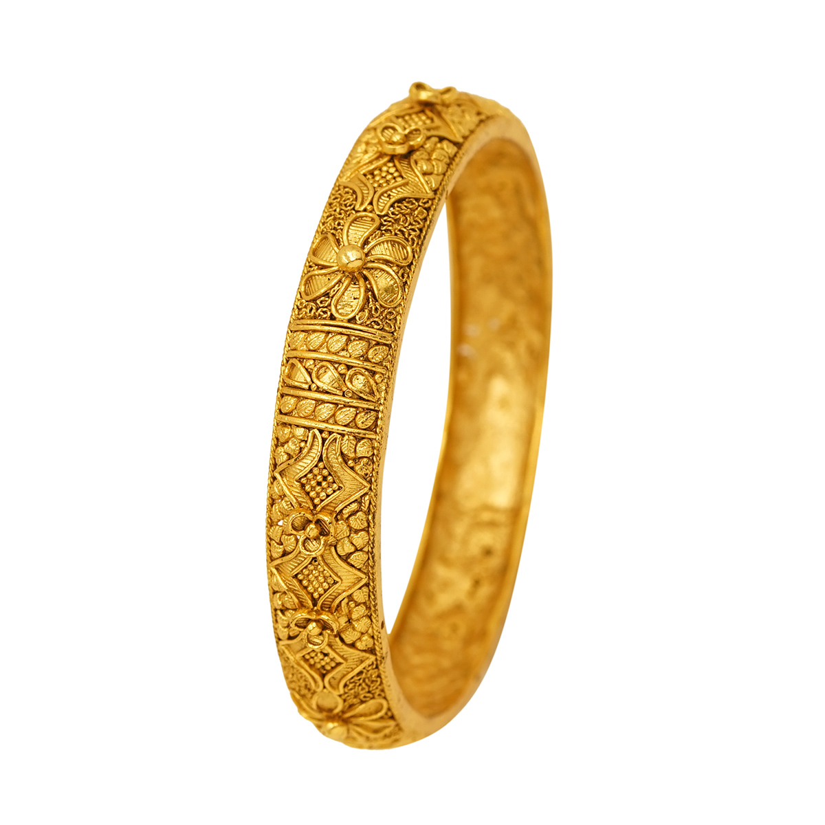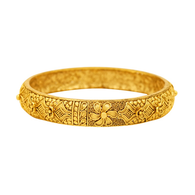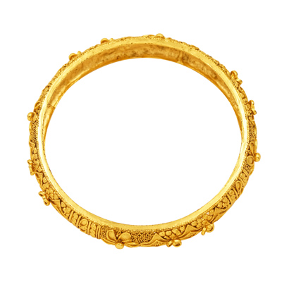 DESCRIPTION - A PAIR OF GOLD-TONE BANGLES FEATURING AN INTRICATE LATTICE CUTWORK DESIGN AND A TEXTURED SHIMMERING FINISH. THESE BANGLES ARE TYPICALLY MADE WITH A BASE METAL LIKE COPPER OR BRASS AND THEN PLATED WITH GOLD, OFFERING A LUXURIOUS APPEARANCE THAT IS LIGHTWEIGHT AND MORE AFFORDABLE THAN SOLID GOLD.
