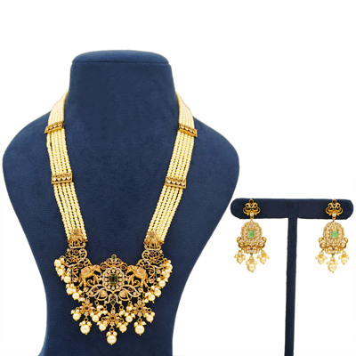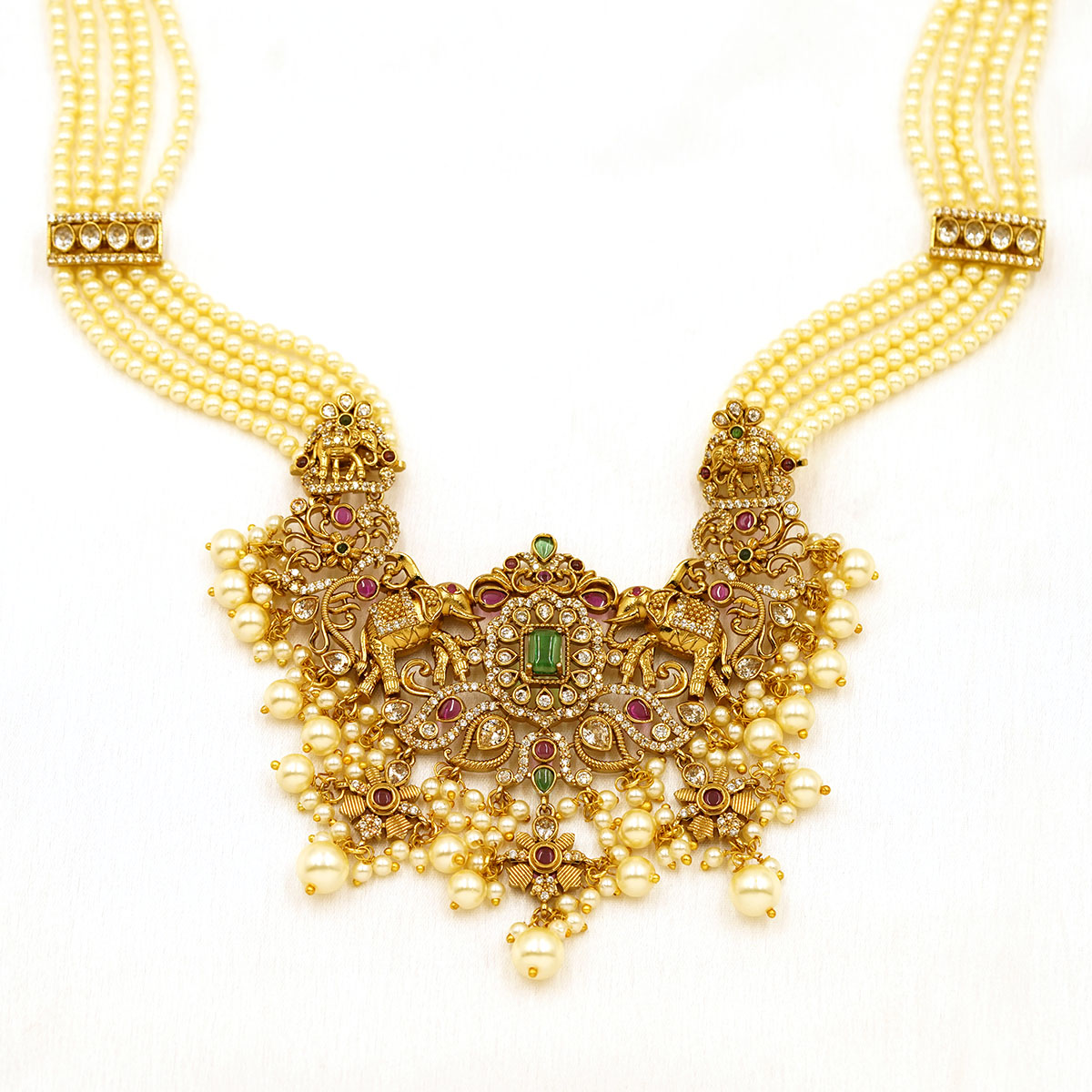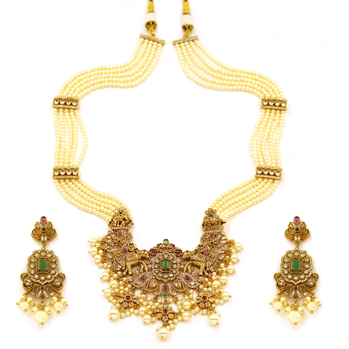DESCRIPTION - A MAJESTIC MULTI-STRAND PEARL NECKLACE ADORNED WITH AN INTRICATELY CRAFTED KUNDAN-STYLE GOLD TONE PENDANT, FINISHED WITH DELICATE PEARL DROPS FOR A ROYAL TOUCH. PAIRED WITH MATCHING CHANDELIER EARRINGS, THIS ELEGANT SET BLENDS TRADITIONAL ARTISTRY WITH TIMELESS GRACE—PERFECT FOR BRIDAL WEAR, WEDDINGS, AND GRAND FESTIVE OCCASIONS. A STATEMENT PIECE THAT EXUDES HERITAGE CHARM AND SOPHISTICATION.