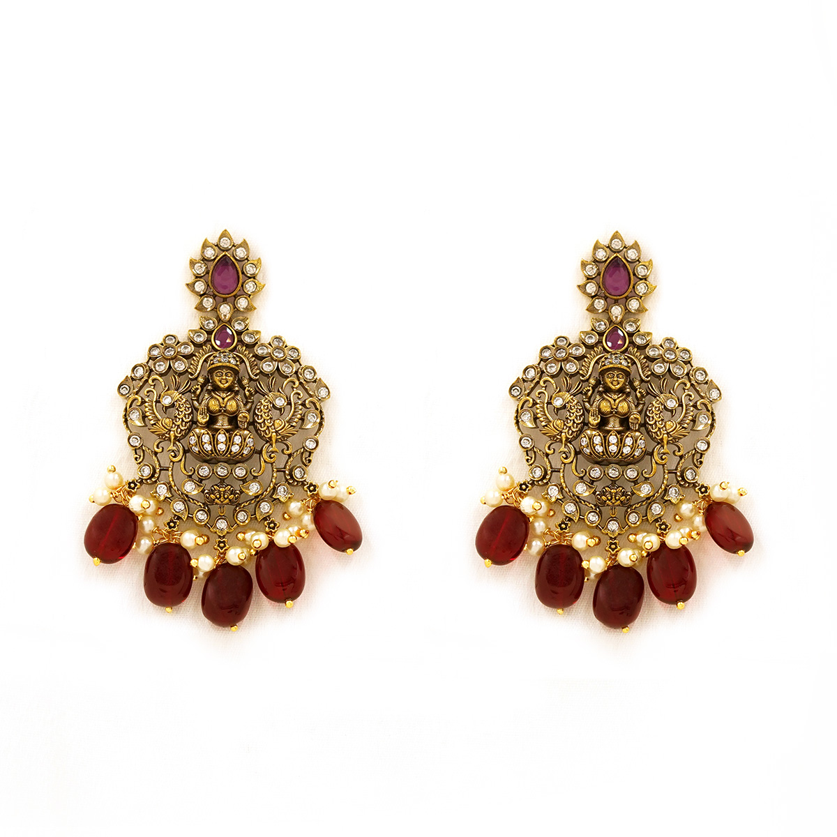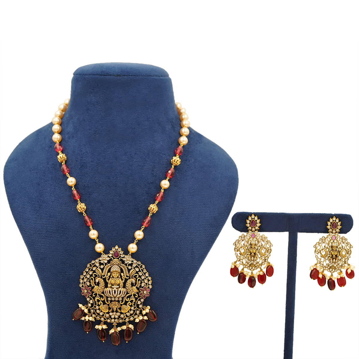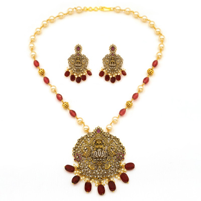 DESCRIPTION - Exuding timeless South Indian grandeur, this regal temple-style necklace set features an intricately carved Goddess Lakshmi pendant framed with traditional gold tone detailing. Accented with luminous pearls and deep ruby-hued drops, the necklace is beautifully complemented by matching chandelier earrings that mirror the ornate craftsmanship. Perfect for weddings, festive occasions, and traditional attire, this set brings divine elegance and royal charm to every ensemble.