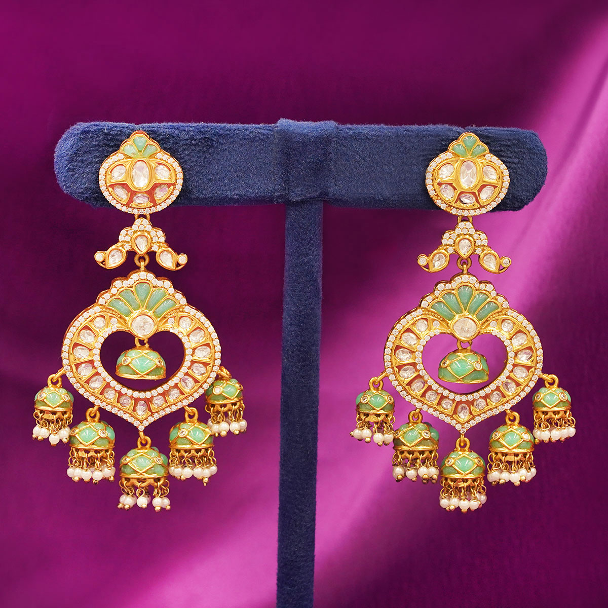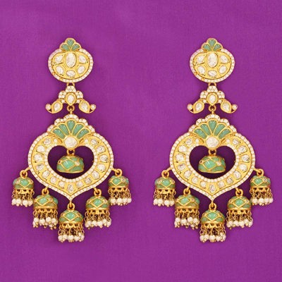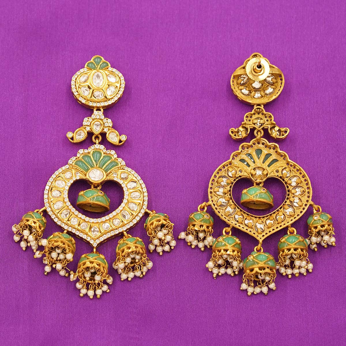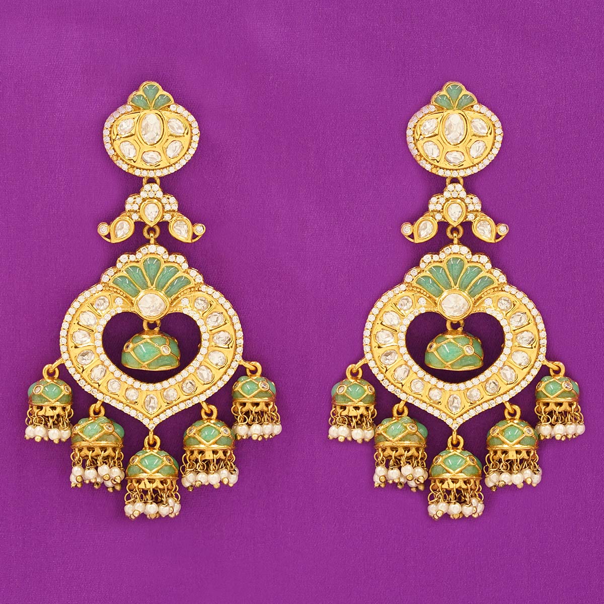 DESCRIPTION - These elegant earrings showcase a heart-shaped Kundan centerpiece highlighted with soothing emerald-green enamel work. The layered jhumka drops adorned with shimmering stones and pearl clusters add a rich, traditional appeal. Perfect for weddings, festive functions, and royal ethnic attire.