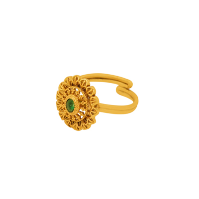 DESCRIPTION - THE RING IN THE IMAGE IS FORMALLY TITLED THE ESTELE GOLD TONE PLATED BLOSSOM MATTE FINISH ADJUSTABLE FINGER RING WITH GREEN CRYSTALS. IT FEATURES A LARGE, TRADITIONAL INDIAN DESIGN WITH INTRICATE, LACE-LIKE METALWORK (FILIGREE STYLE) AND A PROMINENT CENTRAL GREEN STONE. THIS TYPE OF ORNATE AND OVERSIZED JEWELRY IS COMMONLY REFERRED TO AS A COCKTAIL OR STATEMENT RING.