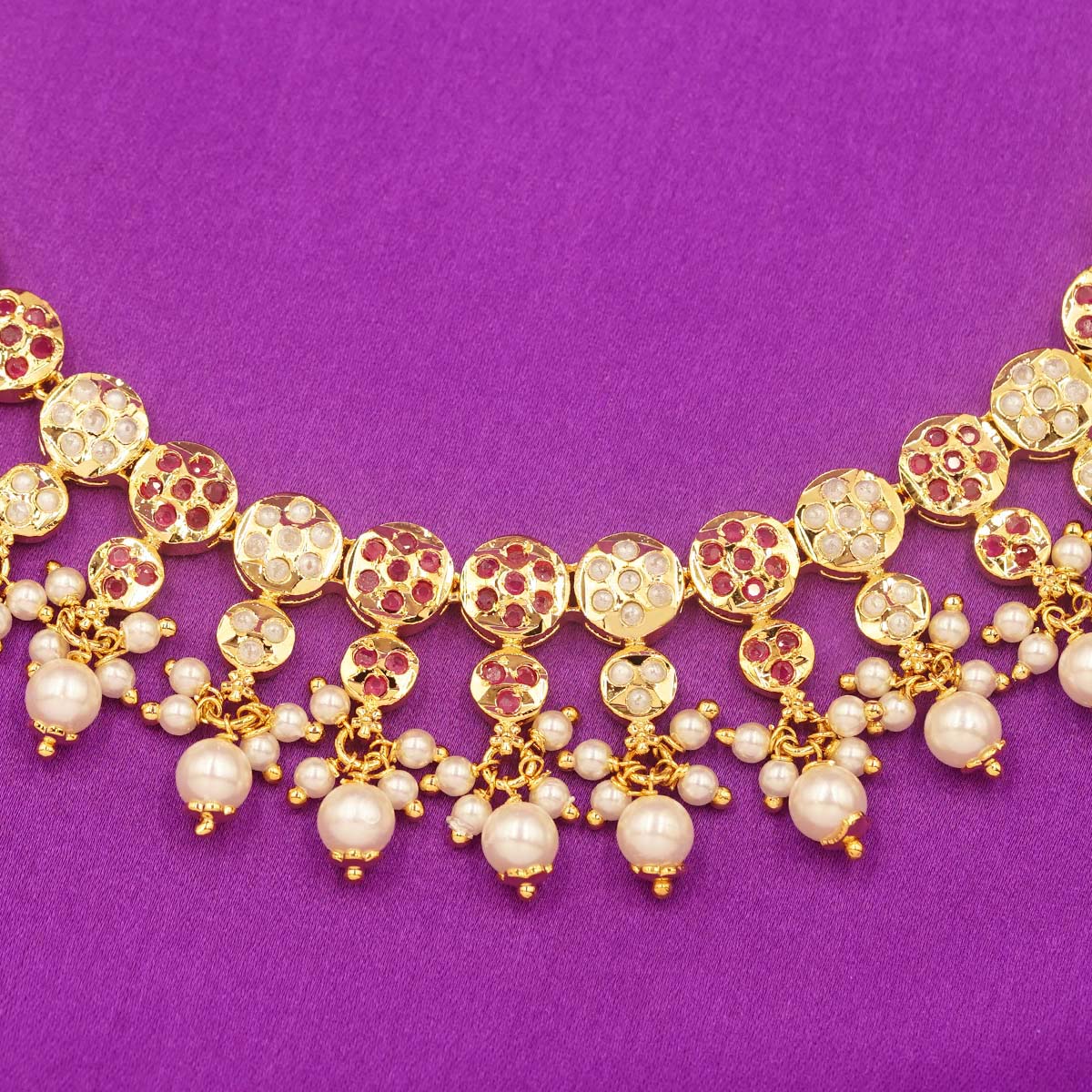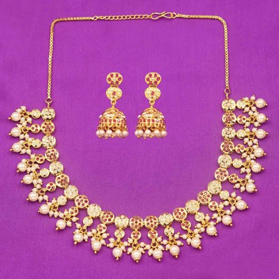 DESCRIPTION - the Golden Tone Pearl Cascade Necklace Set. Featuring a beautifully crafted gold-toned necklace adorned with delicate pearl drops, this set exudes grace and sophistication. The matching earrings mirror the cascading pearl design, creating a perfectly coordinated ensemble. Ideal for weddings, festive occasions, or elegant evening wear, this necklace set enhances both traditional and contemporary outfits with its refined charm and radiant finish.