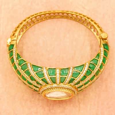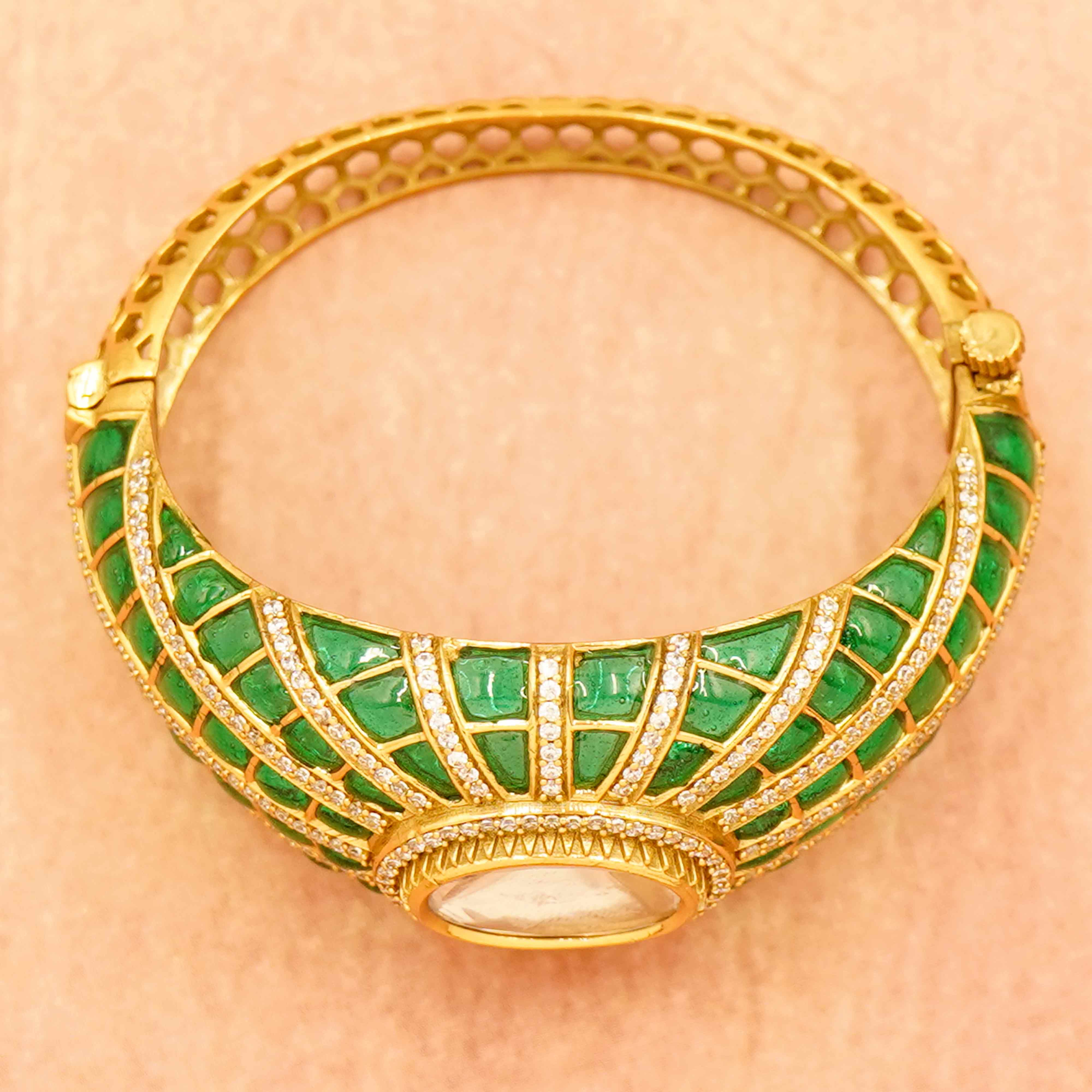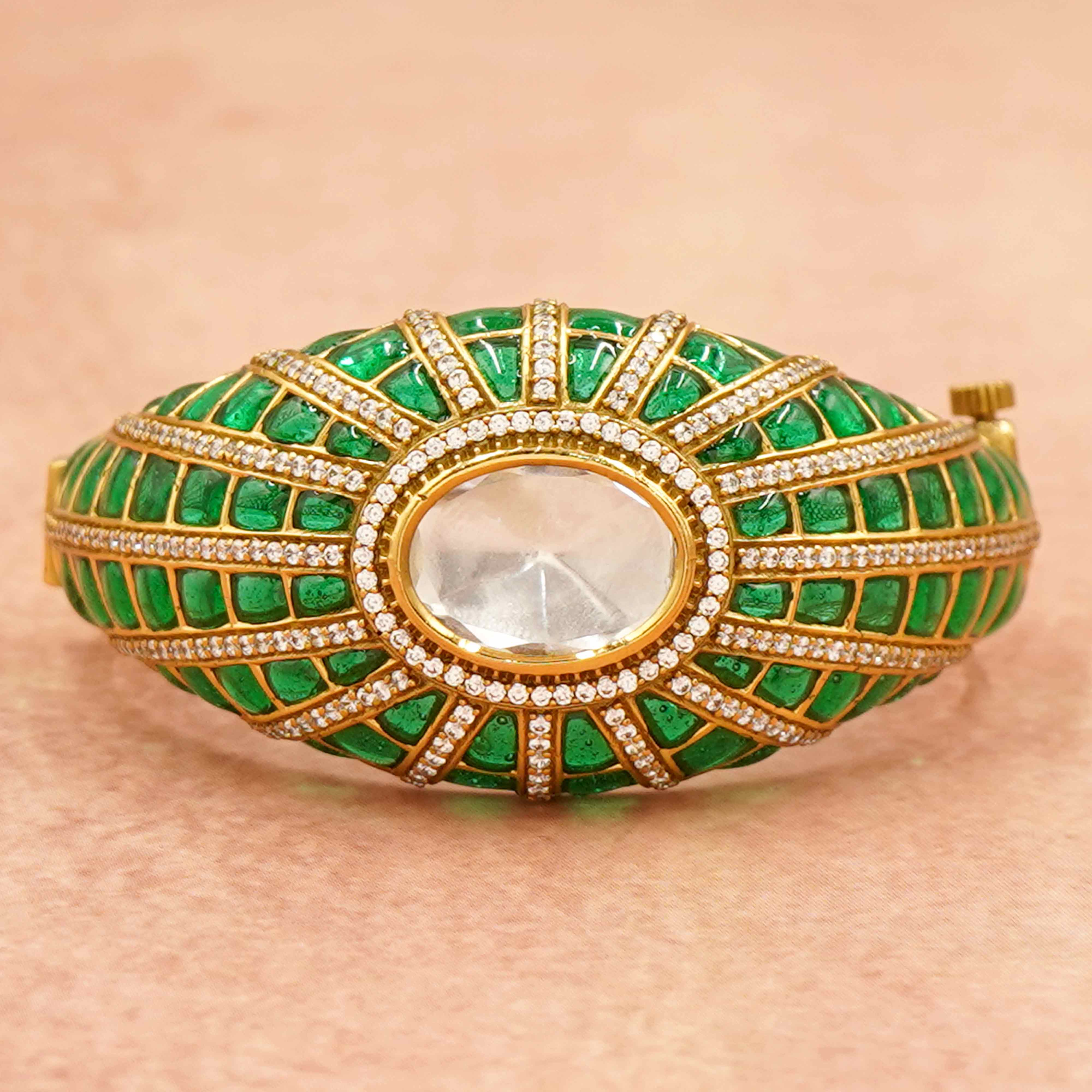 DESCRIPTION - MAKE A STRIKING STYLE STATEMENT WITH THIS EXQUISITE GREEN ENAMEL KUNDAN BRACELET. DESIGNED WITH A RADIANT CENTRAL STONE AND FRAMED BY SHIMMERING CUBIC ZIRCONIA ACCENTS, THIS PIECE SHOWCASES FINE CRAFTSMANSHIP AND ELEGANT DETAILING. THE RICH GREEN ENAMEL WORK ADDS A REGAL CHARM, MAKING IT PERFECT FOR WEDDINGS, FESTIVE OCCASIONS, AND TRADITIONAL CELEBRATIONS. LIGHTWEIGHT YET LUXURIOUS, THIS BANGLE PAIRS BEAUTIFULLY WITH ETHNIC OUTFITS SUCH AS SAREES, LEHENGAS, AND ANARKALIS, ADDING TIMELESS SOPHISTICATION TO YOUR JEWELRY COLLECTION.