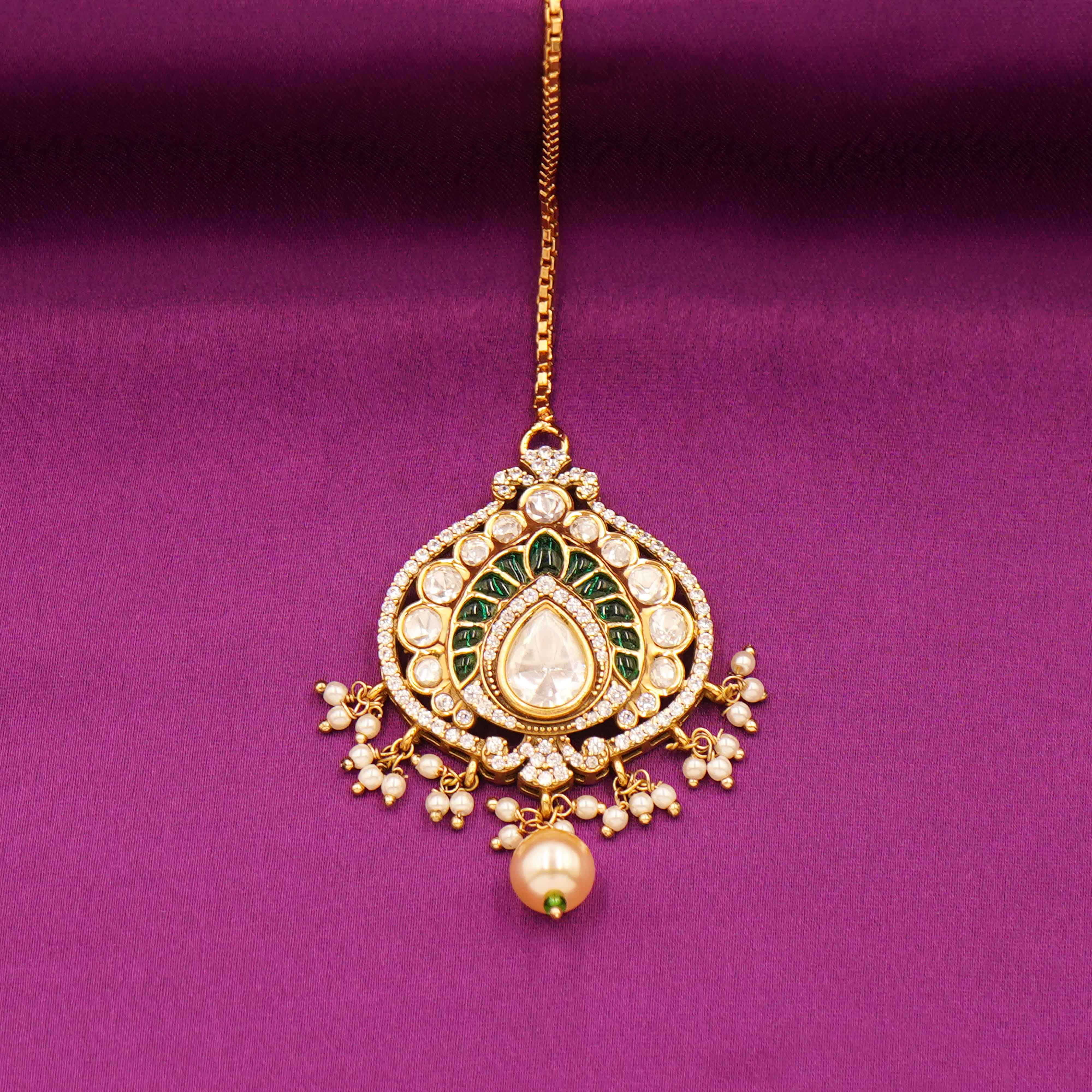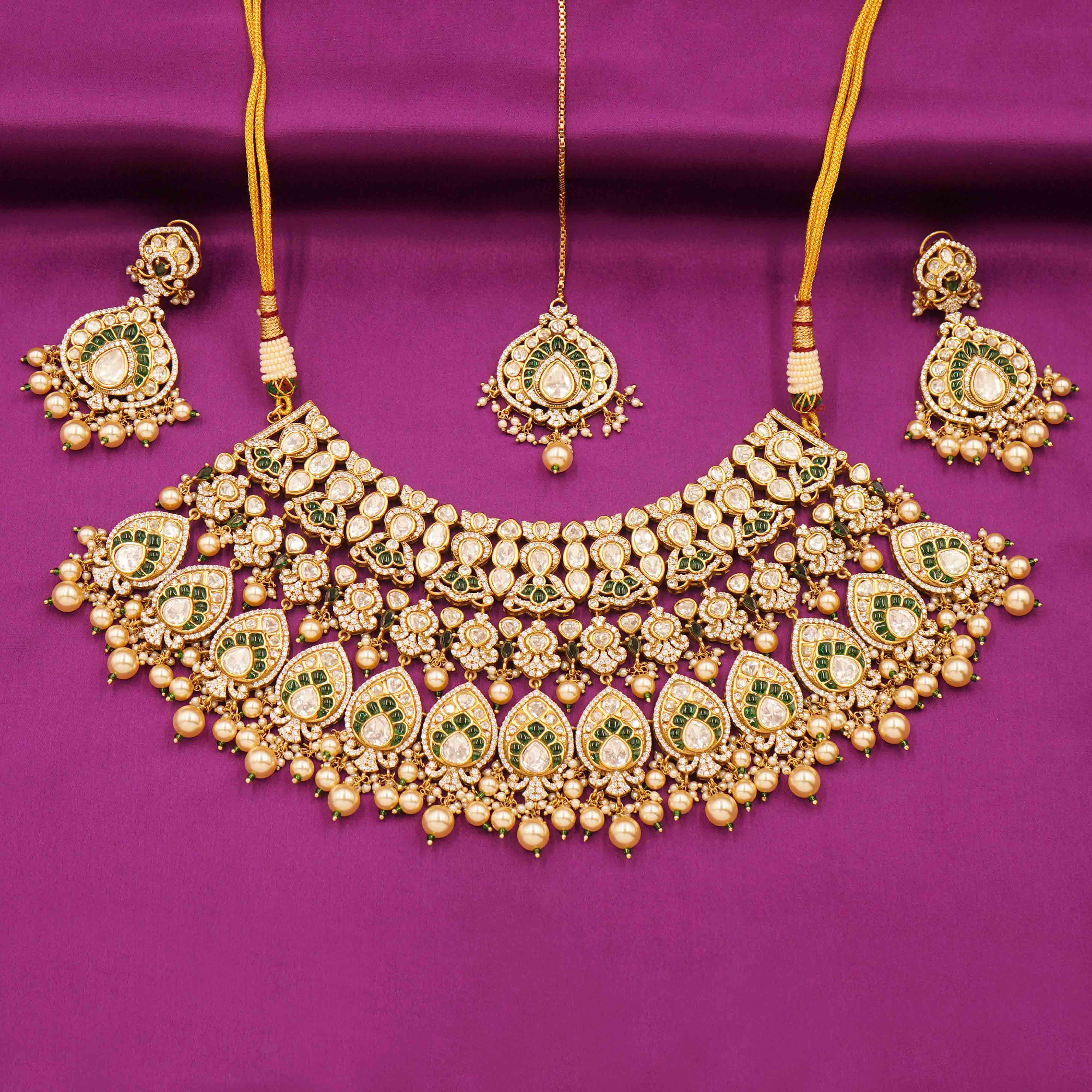 DESCRIPTION - Kundan Necklace Set / Choker Set / Majestic Kundan Bridal Necklace Set Elevate your bridal elegance with this opulent Kundan Necklace set featuring a grand choker necklace, matching earrings, and a delicate maang tikka. Designed with tear-drop shaped green meenakari accents, shimmering white stones, and lustrous pearl drops.