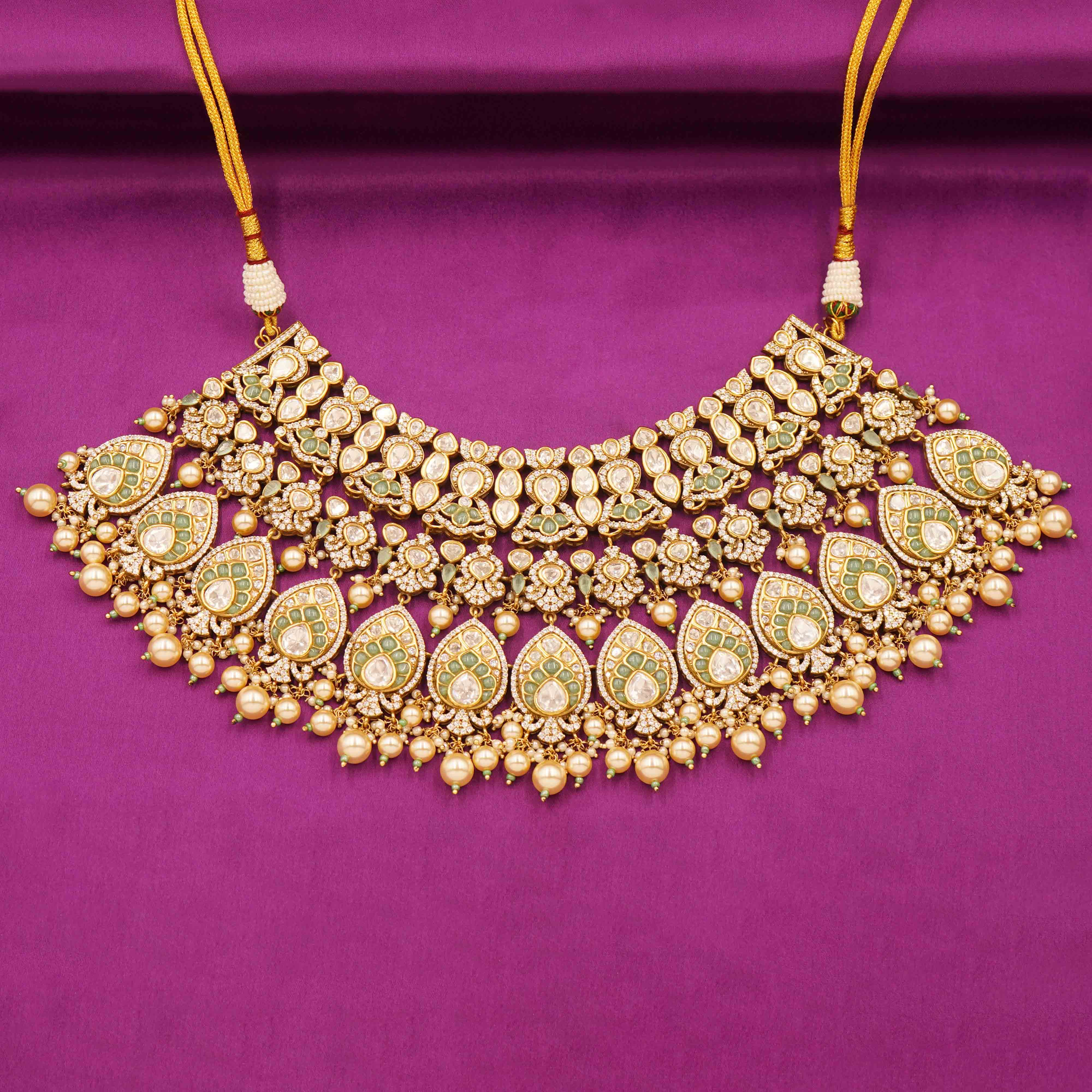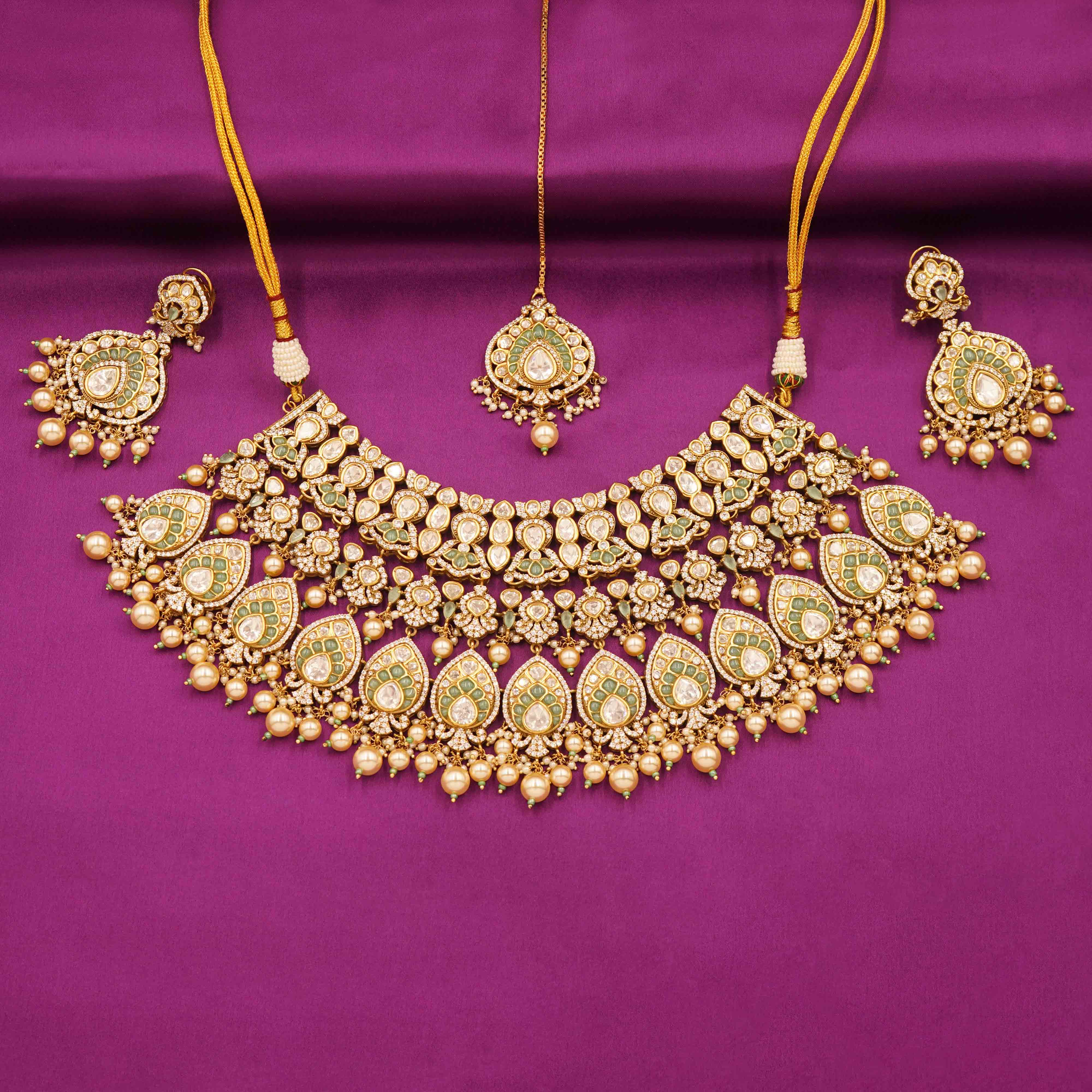 DESCRIPTION - Kundan Necklace Set / Choker Set / Majestic White Kundan Bridal Necklace Set Make a statement with this breathtaking Kundan choker necklace featuring exquisite Mint meenakari detailing and elegant tear-drop motifs. Intricately studded with shimmering stones and finished with delicate pearl drops, this layered necklace brings a perfect blend of tradition and luxury.