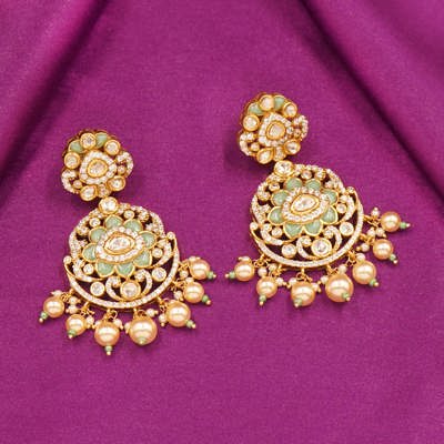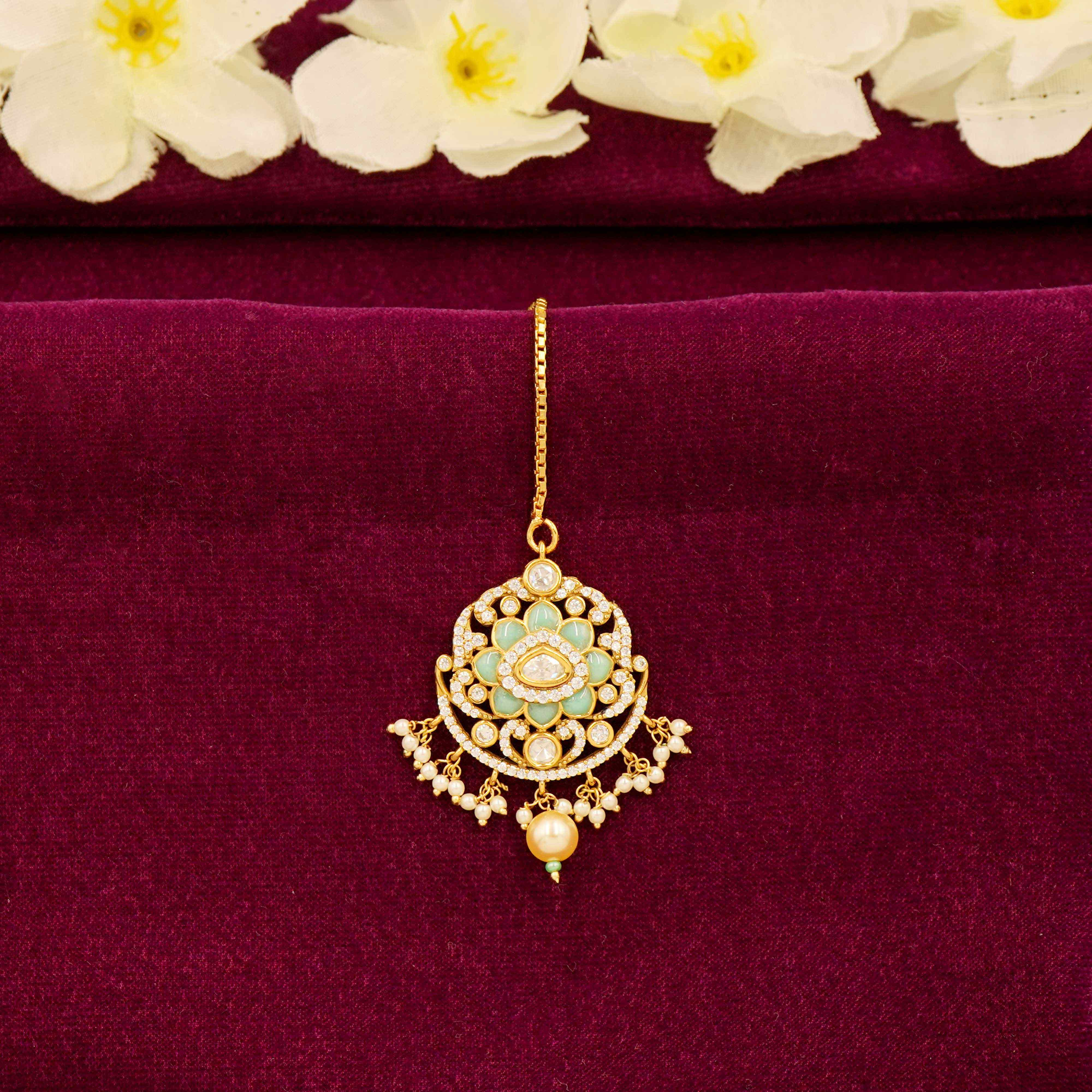 DESCRIPTION - Delicately designed with Regal Mint Stone enamel work and classic Kundan stones, this bridal jewelry set is a graceful blend of tradition and trend. Featuring a layered pearl necklace with teardrop embellishments, matching earrings, and a coordinating maang tikka.