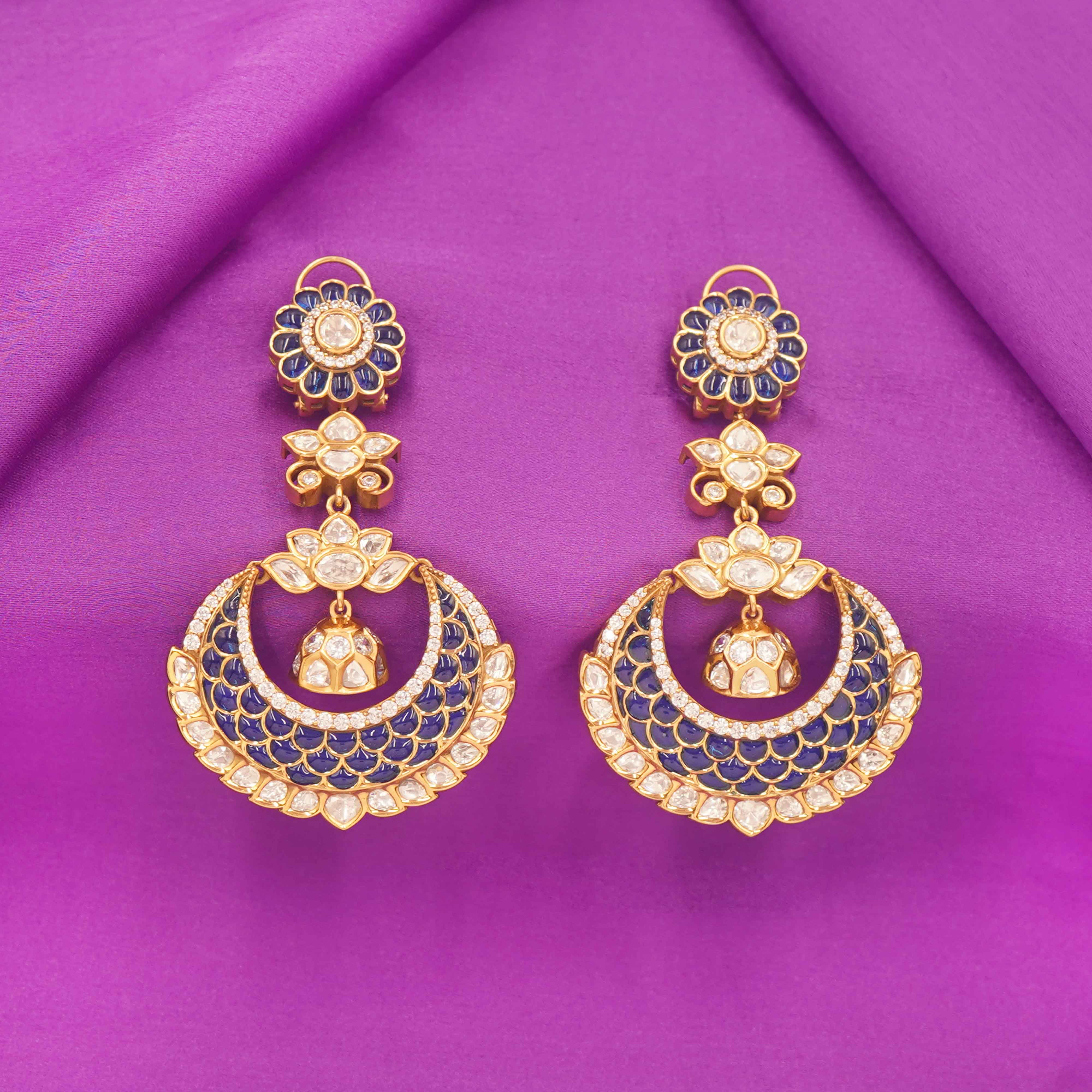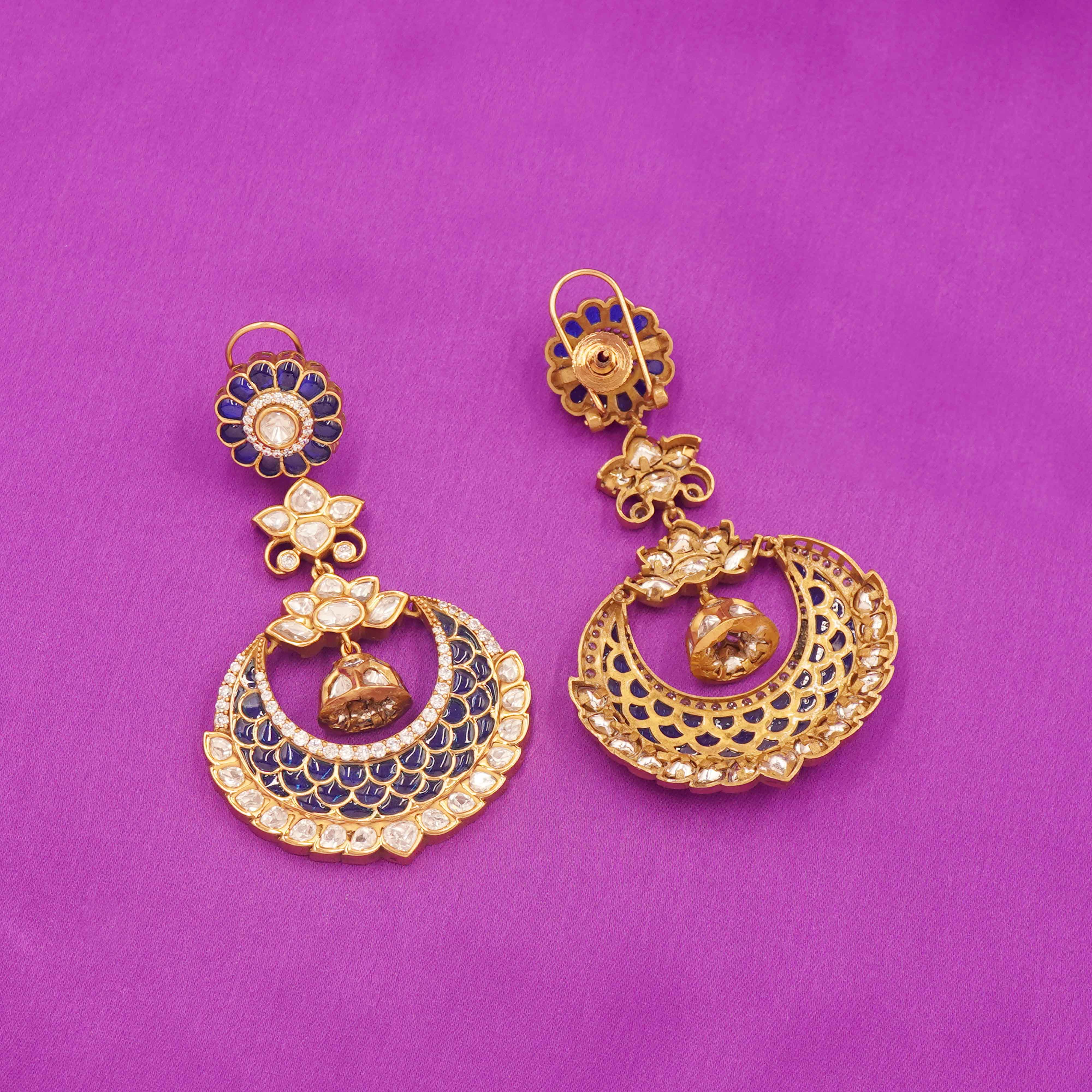 DESCRIPTION - Kundan Earring / Earring / Royal Blue Crescent Chandbali Earrings Turn heads with these royal blue crescent chandbali earrings, beautifully accented with shimmering stones and intricate floral motifs. The bold blue shade combined with a layered jhumki drop brings out a regal aesthetic, perfect for traditional and celebration wear.