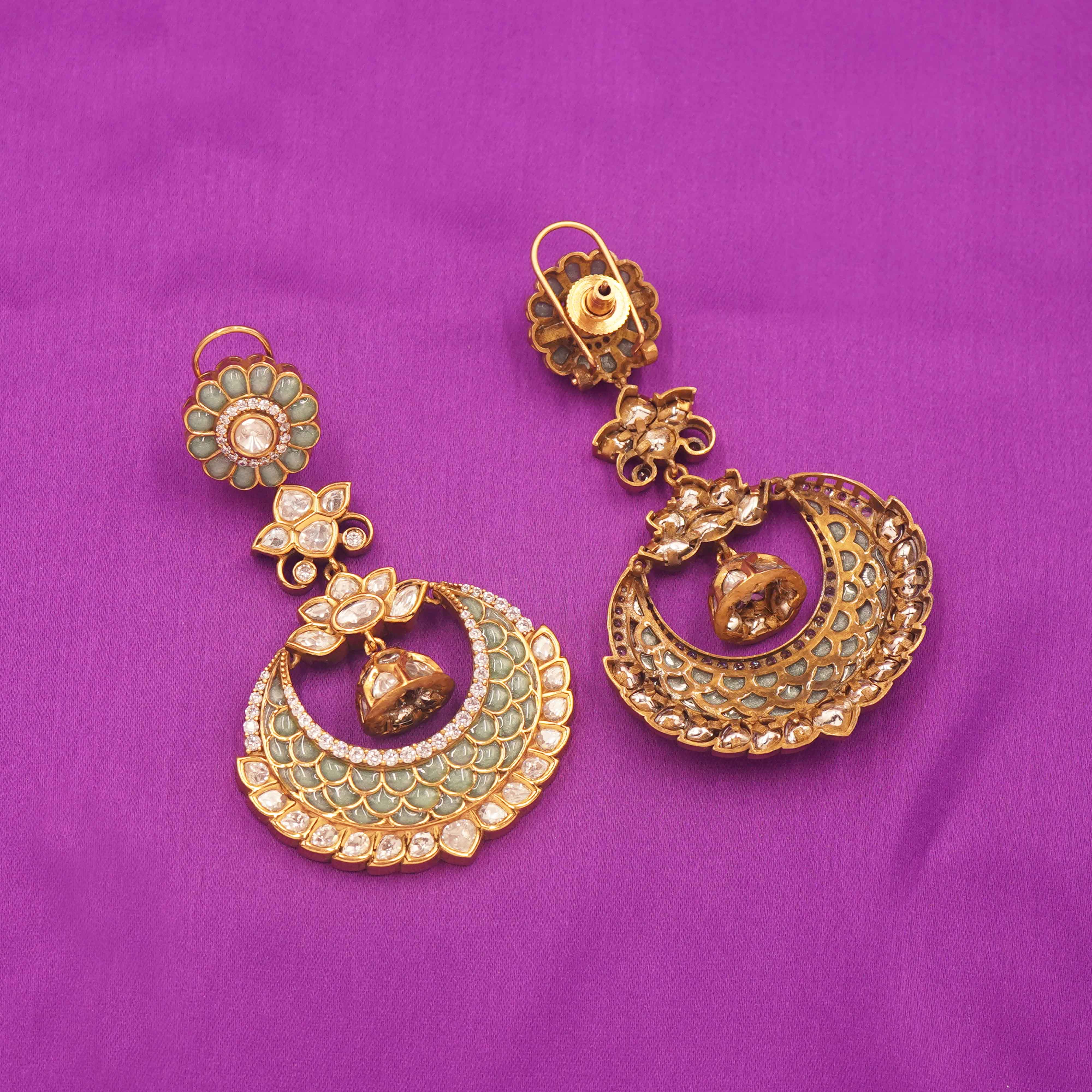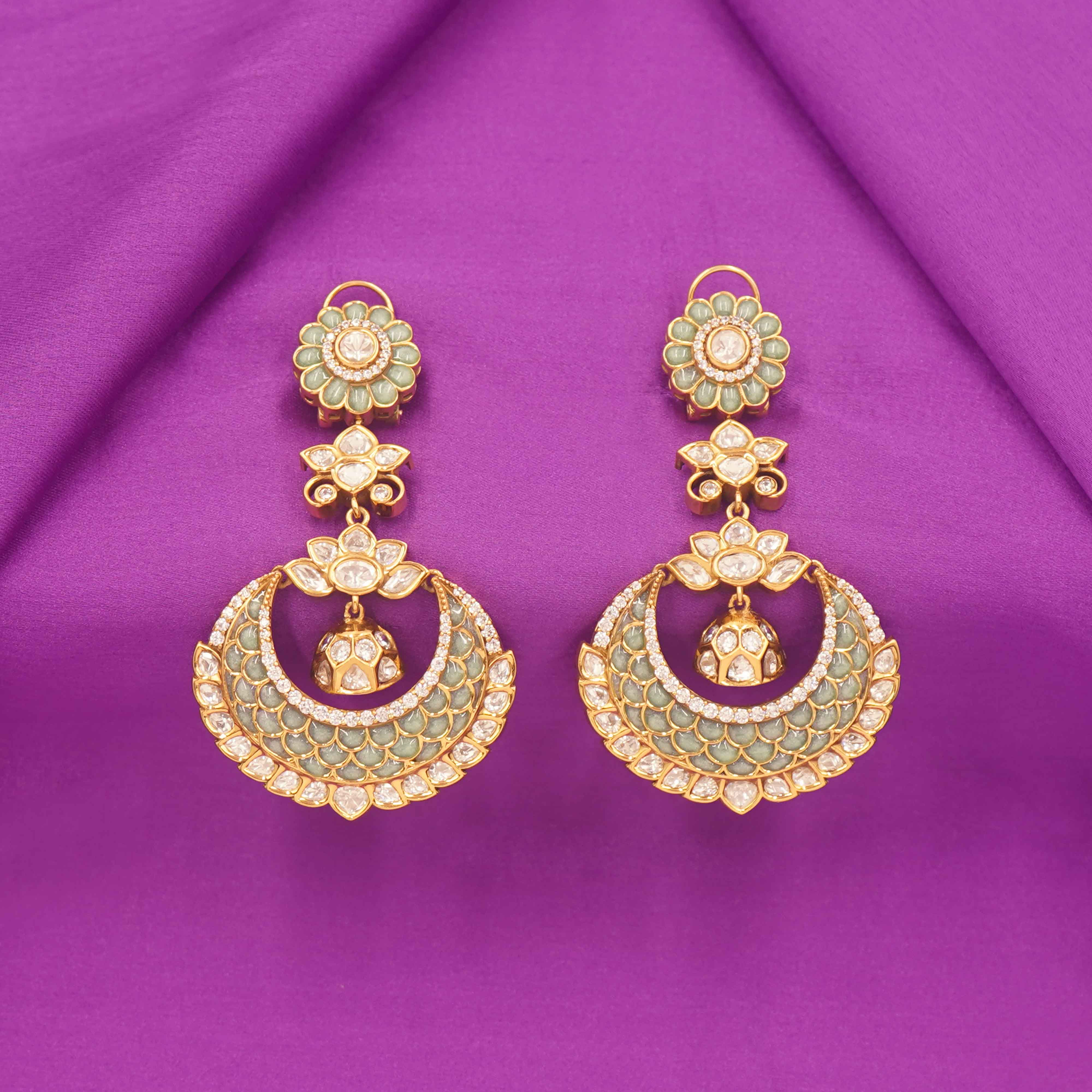 DESCRIPTION - Kundan Earring / Earring / Mint Green Crescent Chandbali Earrings with Floral Accents Grace your festive wardrobe with these elegant mint green crescent chandbali earrings, adorned with floral motifs and a charming central jhumki. Perfect for weddings, ethnic parties, or festive occasions, they add just the right amount of sparkle to your ensemble.