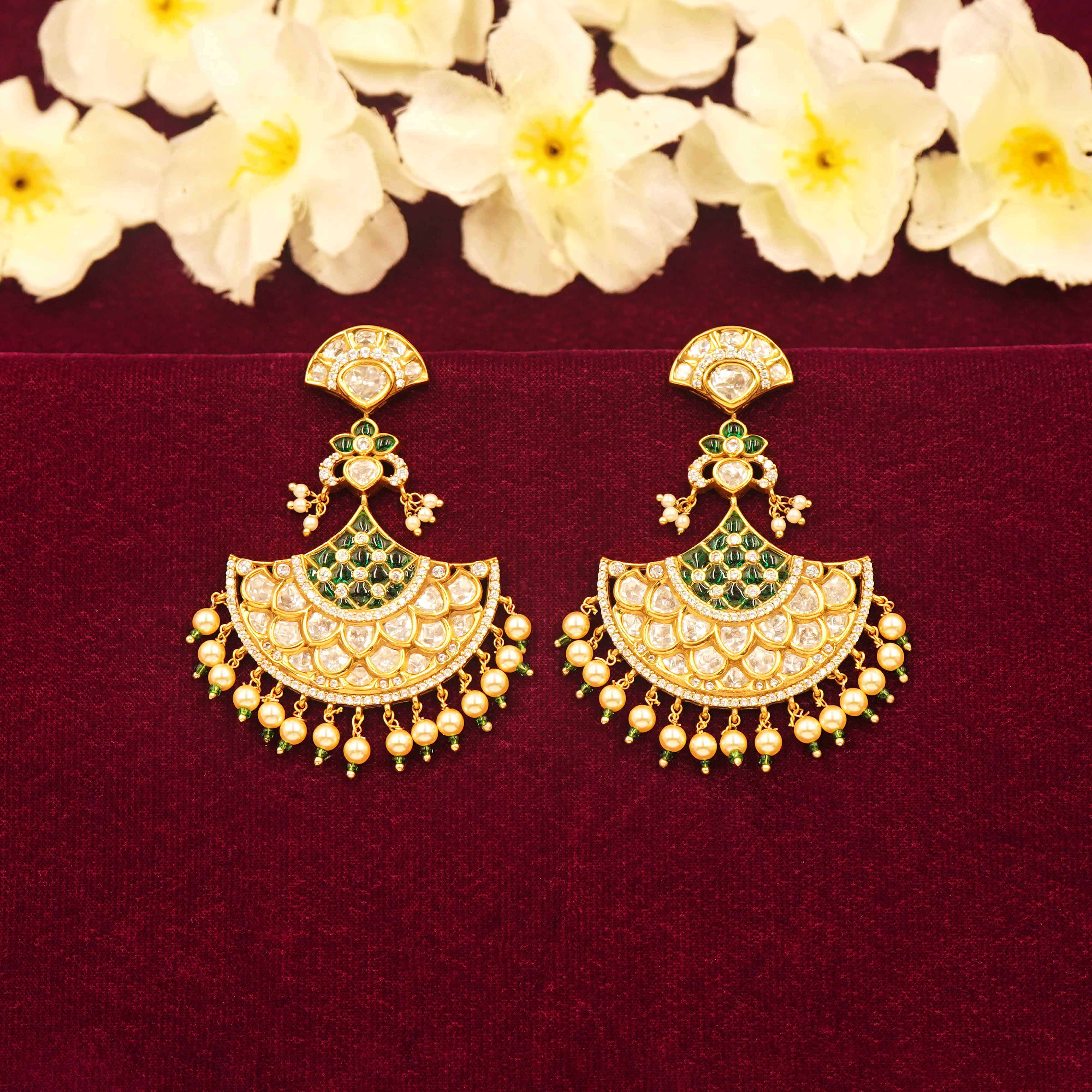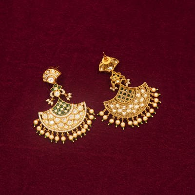 DESCRIPTION - Kundan Earring / Earring / Green & Pearl Drop Chandbali Earrings Add a graceful ethnic flair to your look with these green and pearl drop chandbali earrings, designed with exquisite floral detailing and shimmering accents. Ideal for festive occasions, weddings, or special celebrations, these artificial earrings are lightweight and comfortable, yet rich in craftsmanship and style.