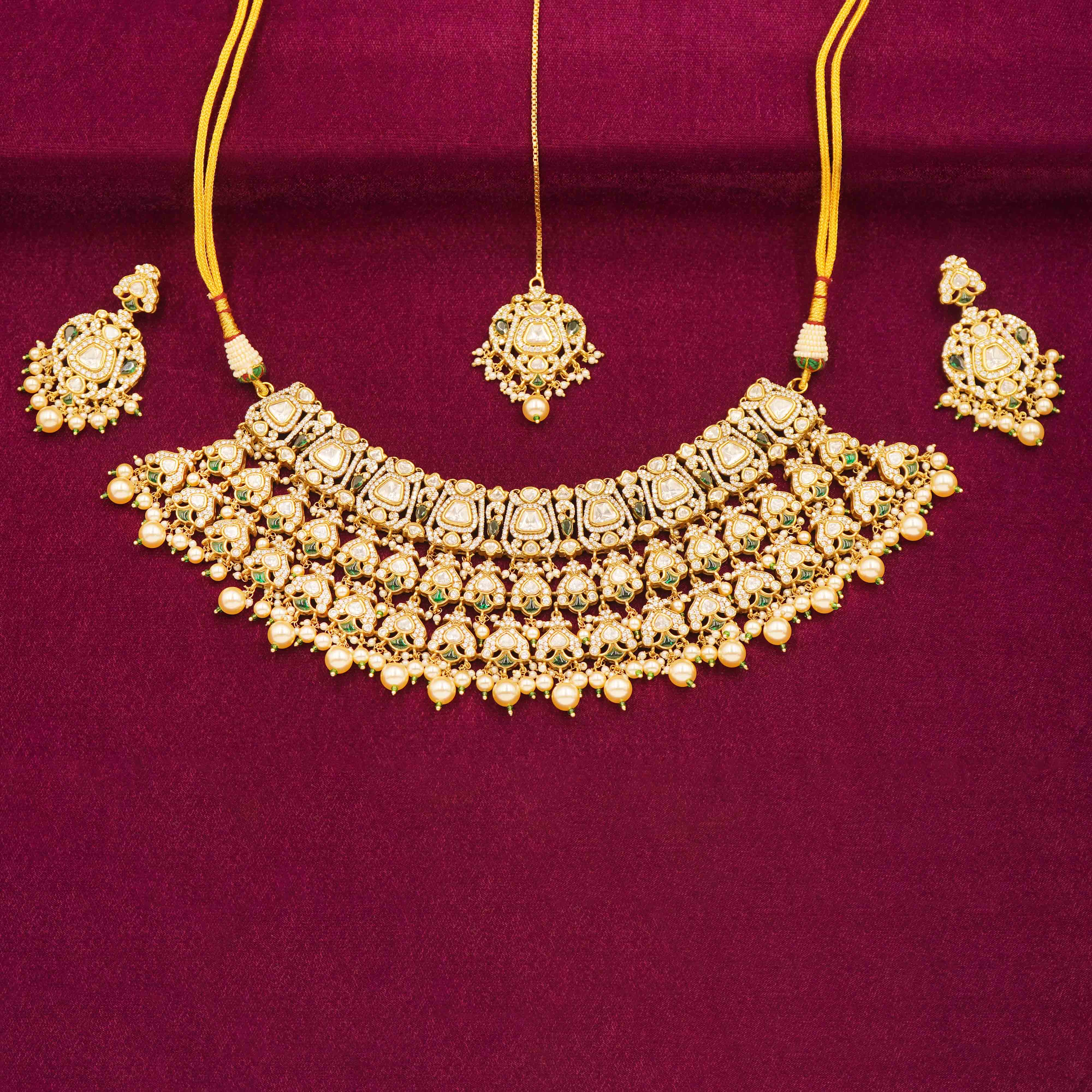 DESCRIPTION - Kundan Necklace Set / Choker Set / Heavy Kundan Bridal Necklace Set Step into royal elegance with this heavy Kundan bridal Necklace set, featuring a grand layered necklace, matching earrings, and a coordinating maang tikka. Finished with multi-strand side beading, this necklace adds a regal charm to your festive and bridal ensembles.