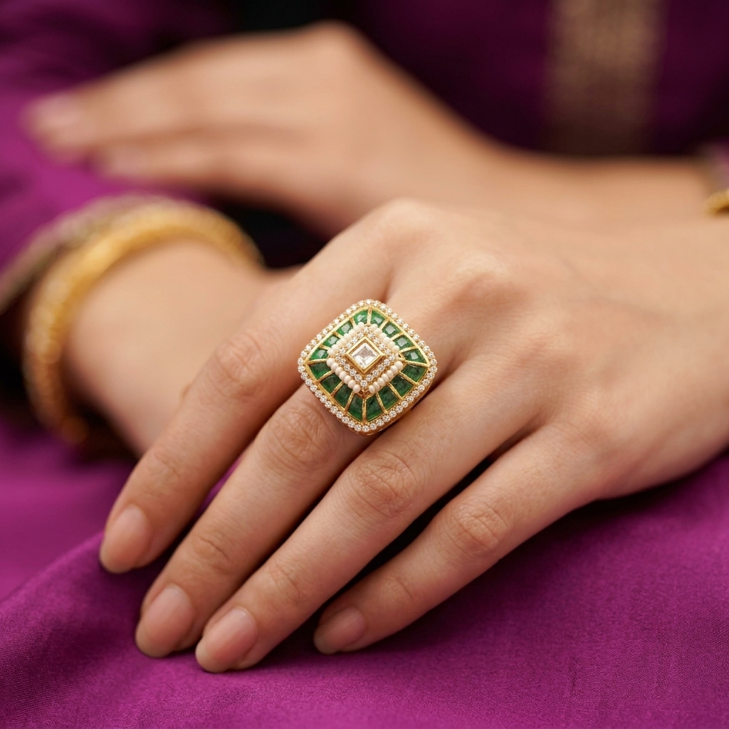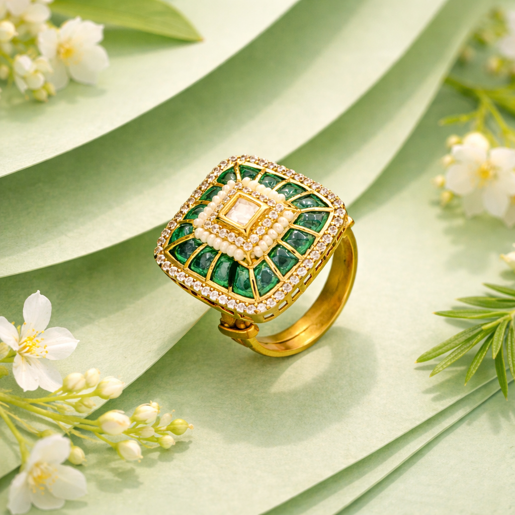 DESCRIPTION - THIS REGAL GOLD TONE RING SHOWCASES A STRIKING EMERALD-CUT GREEN STONE FRAMED BY A RADIANT HALO OF SHIMMERING ACCENTS. THE RICH GREEN CENTERPIECE SYMBOLIZES PROSPERITY AND GRACE, WHILE THE INTRICATE GOLD DETAILING ADDS A TOUCH OF ROYAL CHARM. PERFECT FOR FESTIVE OCCASIONS, WEDDINGS, OR AS A SIGNATURE COCKTAIL RING, THIS PIECE BLENDS CLASSIC SOPHISTICATION WITH MODERN GLAMOUR TO ELEVATE ANY ENSEMBLE.