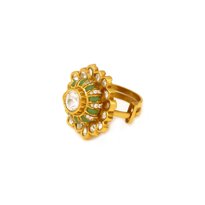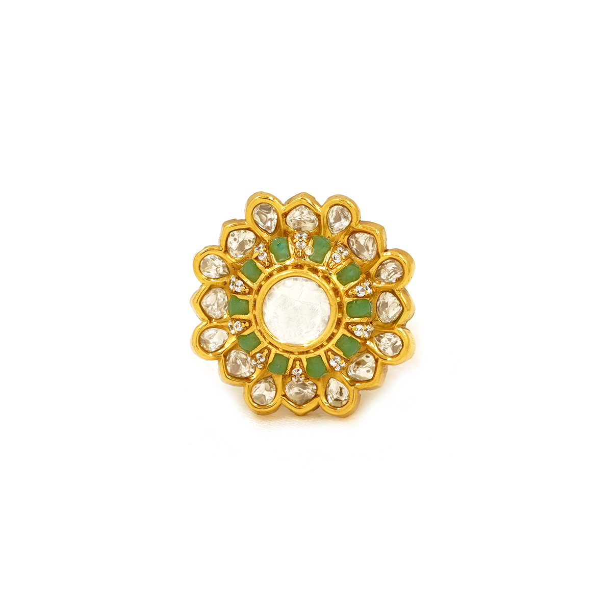 DESCRIPTION - A BREATHTAKING STATEMENT RING CRAFTED IN A RADIANT GOLD TONE FINISH, FEATURING A GRACEFUL FLORAL DESIGN ADORNED WITH LUMINOUS POLKI-STYLE STONES AND RICH GREEN EMERALD ACCENTS AT THE HEART. THE LAYERED PETAL MOTIF ADDS DEPTH AND ROYAL CHARM, MAKING THIS RING A PERFECT BLEND OF TRADITION AND ELEGANCE. IDEAL FOR WEDDINGS, FESTIVE OCCASIONS, AND HEIRLOOM-INSPIRED LOOKS, THIS EXQUISITE PIECE BRINGS TIMELESS SOPHISTICATION TO EVERY GESTURE.