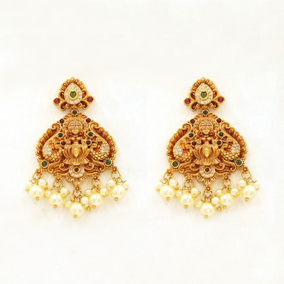 DESCRIPTION - An exquisite temple-style necklace set featuring rows of lustrous pearls adorned with traditional gold-toned spacers and a grand Lakshmi motif pendant. The intricately carved pendant, finished with delicate pearl drops, reflects timeless South Indian artistry and divine elegance. Paired with matching temple earrings, this set is perfect for weddings, festive occasions, and bridal wear, adding a rich, royal charm to any traditional ensemble.