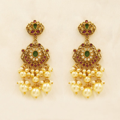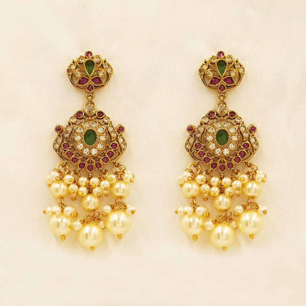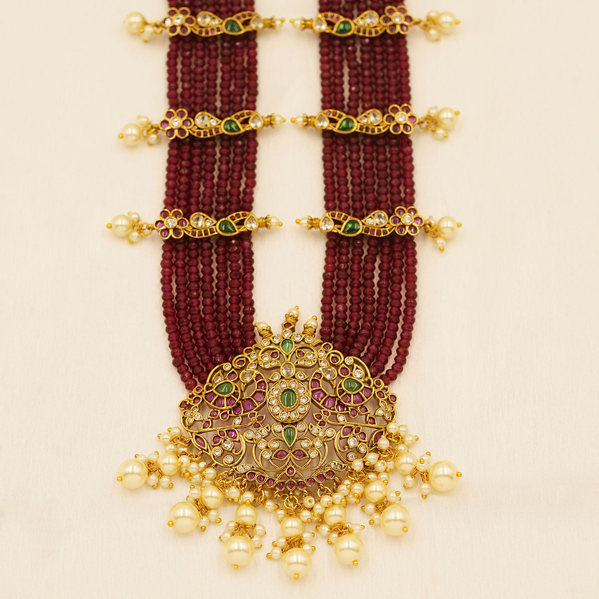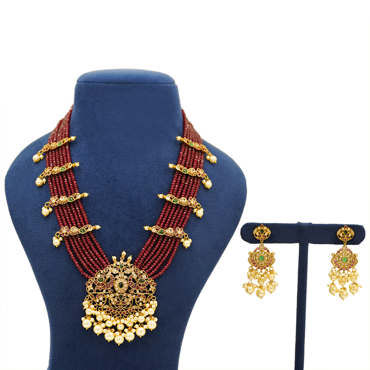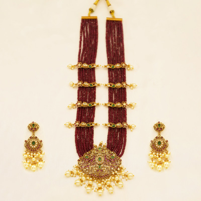 DESCRIPTION - An exquisite temple-inspired necklace set crafted with rich strands of ruby-red beads, beautifully accented with antique gold tone motifs and delicate pearl drops. The grand central pendant showcases intricate floral and deity-inspired detailing, bordered with luminous pearls that add a graceful finishing touch. Paired with matching traditional earrings, this statement set is perfect for weddings, festive occasions, and heritage celebrations, radiating timeless elegance and royal charm.
